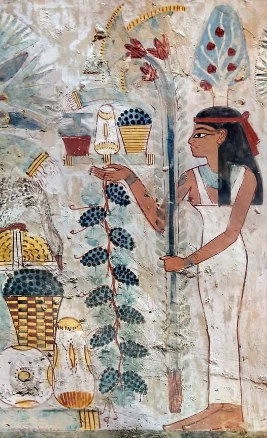 Suspended from her right hand is a grapevine, while her left hand holds three papyrus stems, representing fertility and rebirth. Although not identified by inscription, the goddess—often called the “Lady of the Sycomore”—is traditionally associated with Nut, Hathor, or Isis.