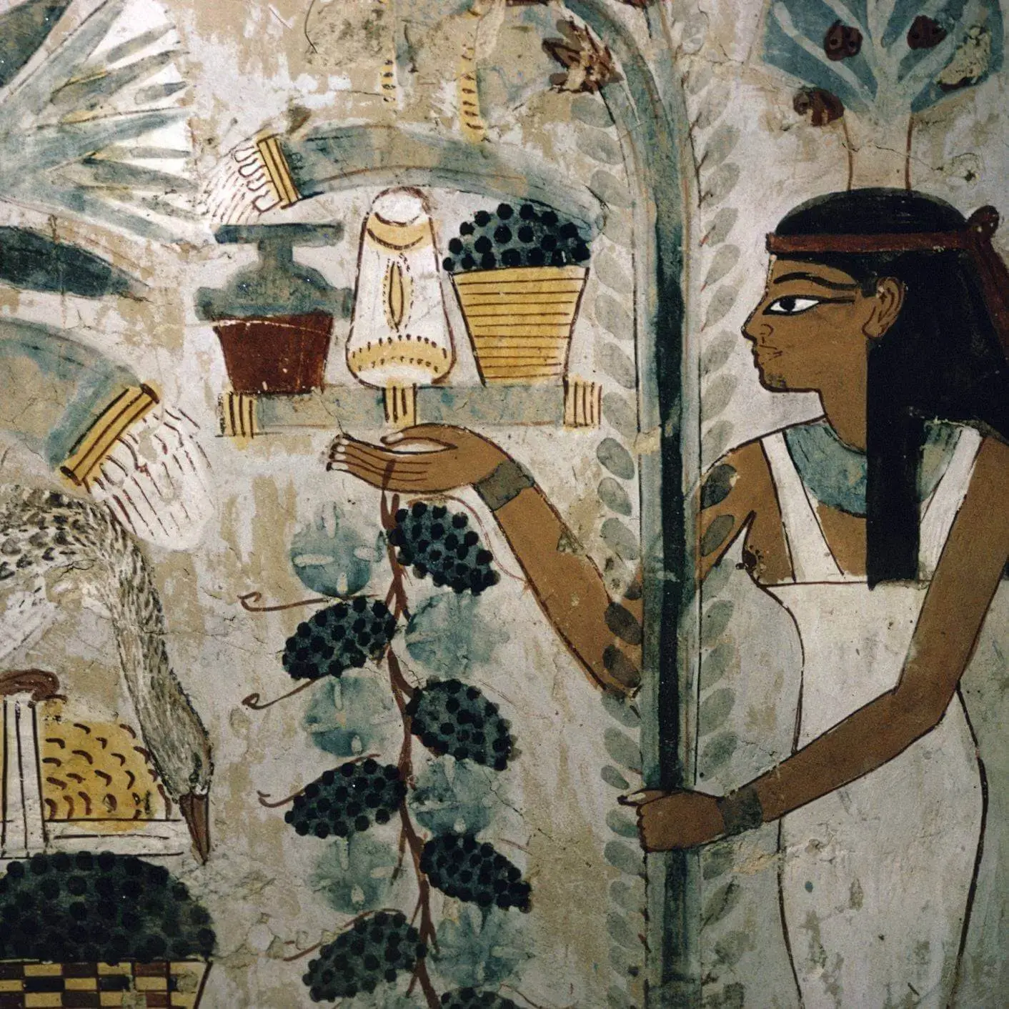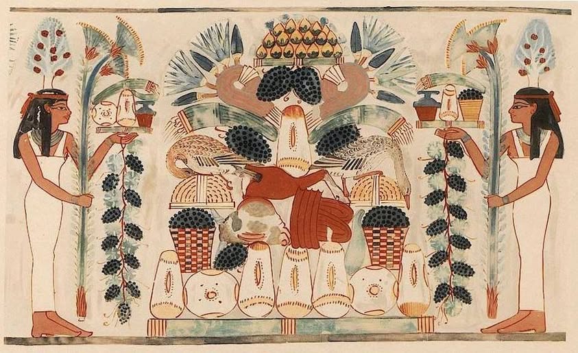 In the beautifully painted Tomb of Nakht at Luxor, a serene scene depicts the Tree Goddess offering sustenance to the deceased. From a tray, she presents beer, an elongated loaf of bread, a cup of grapes, and a bunch of onions—symbols of nourishment and eternal life.