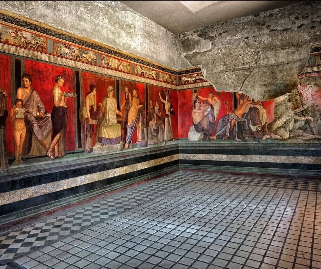 The villa stands just outside the walls of Pompeii, the Roman city famously frozen in time when Mount Vesuvius erupted in 79 AD. In a matter of hours, volcanic ash and pumice buried homes, streets, and villas beneath meters of debris. Yet that destruction became preservation. Sealed from air and moisture, the frescoes survived in remarkable condition — their pigments protected for nearly two millennia.