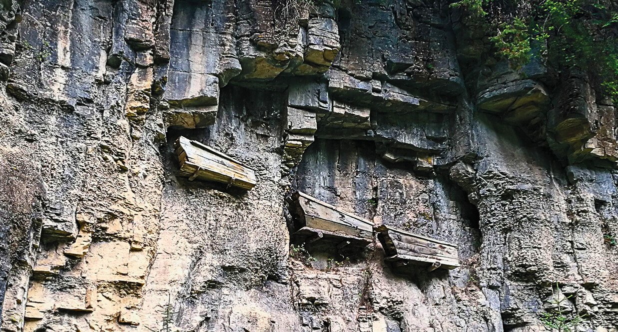 The most famous examples are found along the cliffs of the Yangtze River and in remote valleys of Sichuan and Yunnan provinces. Some coffins are wedged into natural crevices; others rest on wooden beams inserted directly into rock walls. From below, they appear almost impossibly positioned — hovering dozens or even hundreds of feet above the ground.