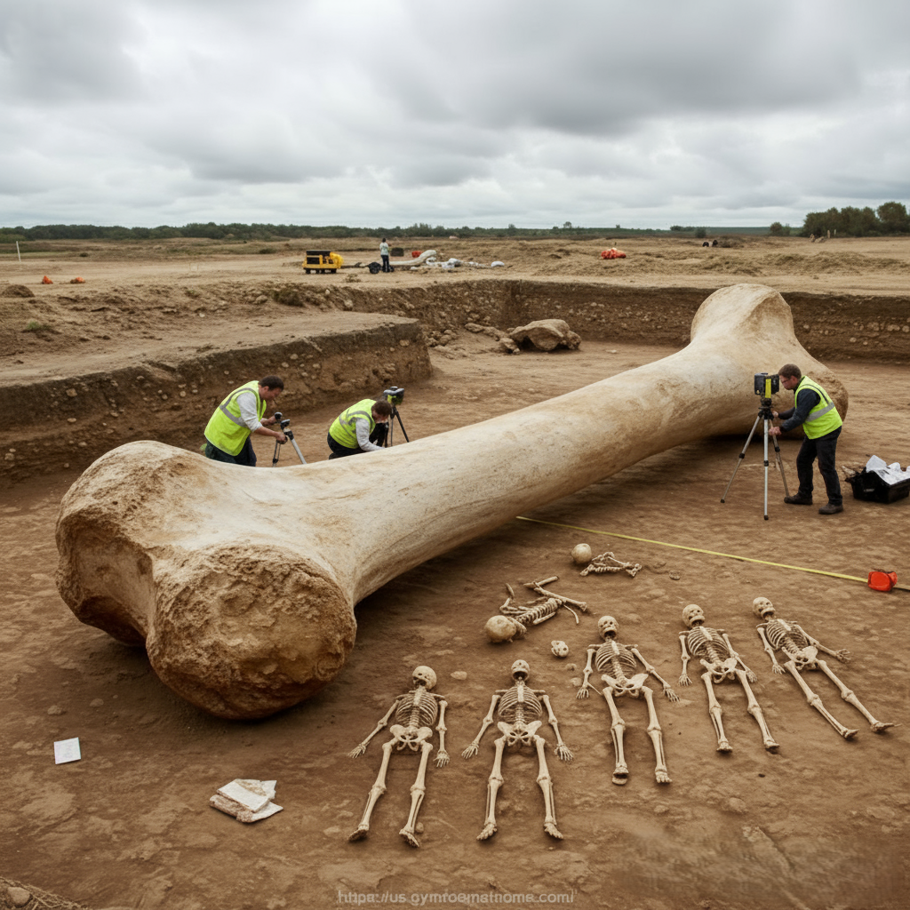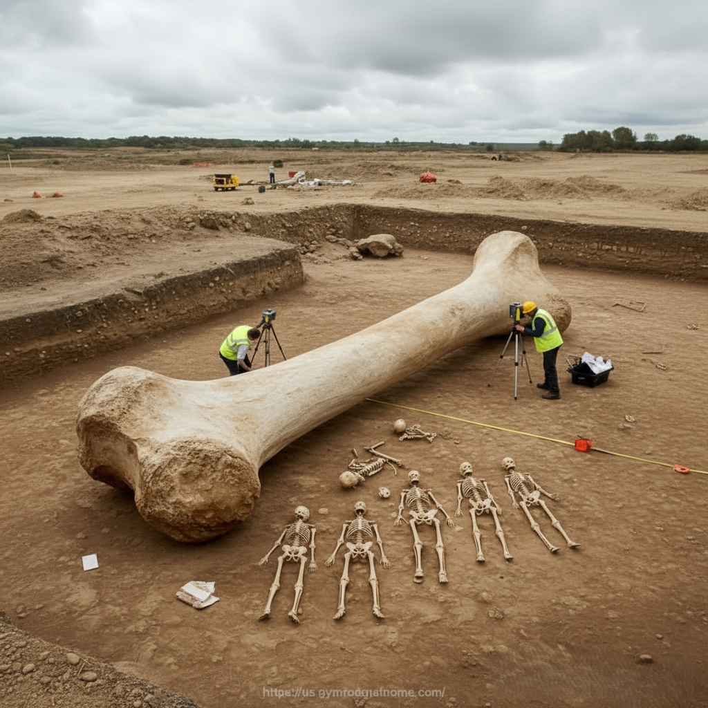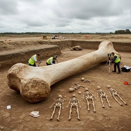 Archaeologists at a remote excavation site have announced a discovery that could challenge everything we thought we knew about human history. Deep beneath layers of sediment, a colossal femur — estimated to be nearly ten times the size of an average human bone — was found lying beside several smaller skeletons of ordinary human proportions. Preliminary studies indicate that the bone’s composition, density, and mineral crystallization patterns differ significantly from any known species on record. Experts are struggling to classify it, as no animal or hominid from any documented era matches such dimensions.