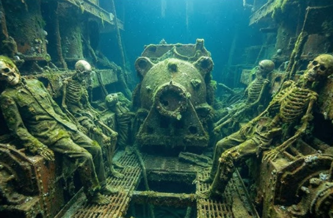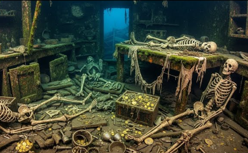 Skeletons remain seated at their stations, some near the helm, others along narrow passageways where they may have rushed in those final moments. Their forms are undisturbed, as though time paused at the instant of catastrophe. No scavenger scattered them. No current claimed them. The crushing depth, devoid of light and oxygen, became an unlikely guardian — halting decay and sealing their last positions into history.