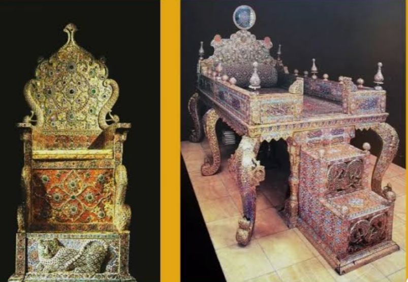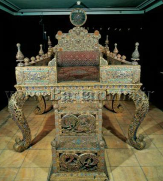 Architecturally, the throne takes the form of an elevated platform rather than a conventional chair. In this respect, it resembles the famous Marble Throne at Golestan Palace in Tehran. The platform design allowed the monarch to sit visibly above courtiers during ceremonies, emphasizing hierarchy and magnificence. A later royal seat, the Naderi Throne, would adopt a more chair-like appearance, marking a stylistic shift in court presentation.