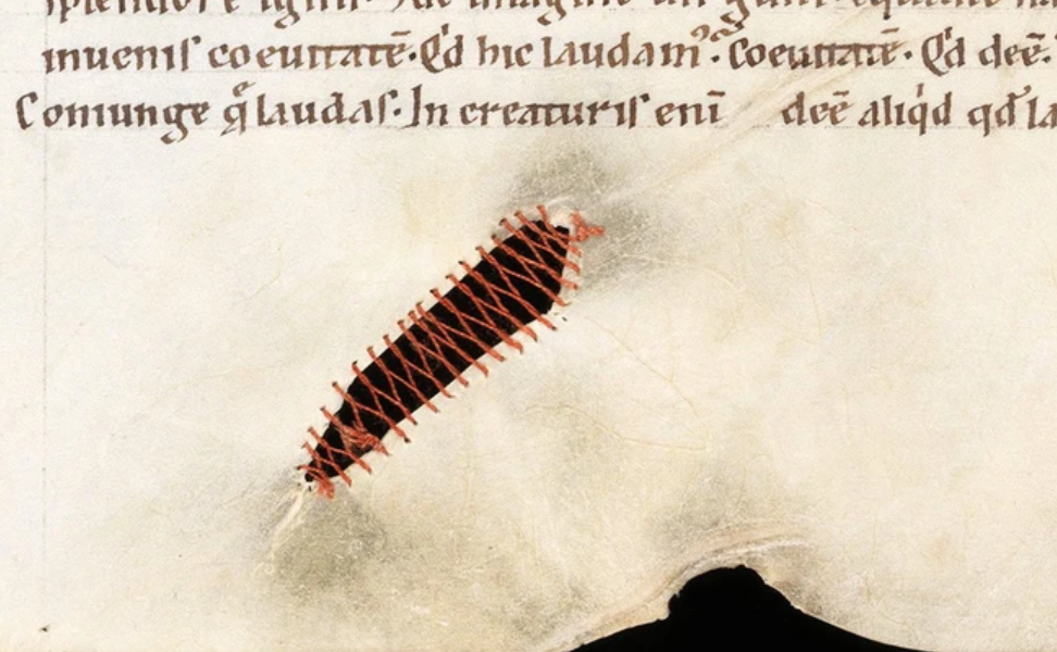 Along the torn edge of a medieval parchment page, fine silk thread winds delicately through small punctures, pulling fractured vellum back together. It is not decorative embroidery. It is preservation — a quiet, practical act of care carried out centuries ago by hands determined to save a book.