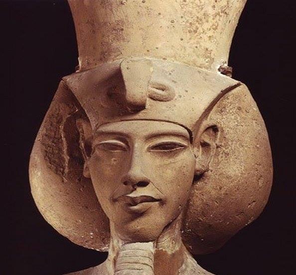 Sandstone Head of King Amenhotep IV (Akhenaten) – Dating to c. 1353–1336 BCE, 18th Dynasty. The king wears the Double Crown of Upper and Lower Egypt and the khat headcloth, with a prominent uraeus on his forehead. Now housed in the Alexandria National Museum.