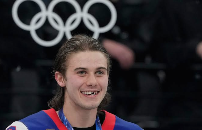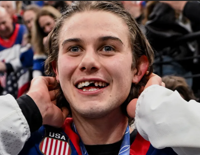 Moments later, in one of the most unforgettable sequences of the tournament, Hughes scored the game-winning goal, securing Olympic gold for Team USA. The dramatic play instantly turned him into a national hero, and images of the star celebrating with a damaged smile quickly spread across social media, symbolizing the toughness and determination that defined the championship game.