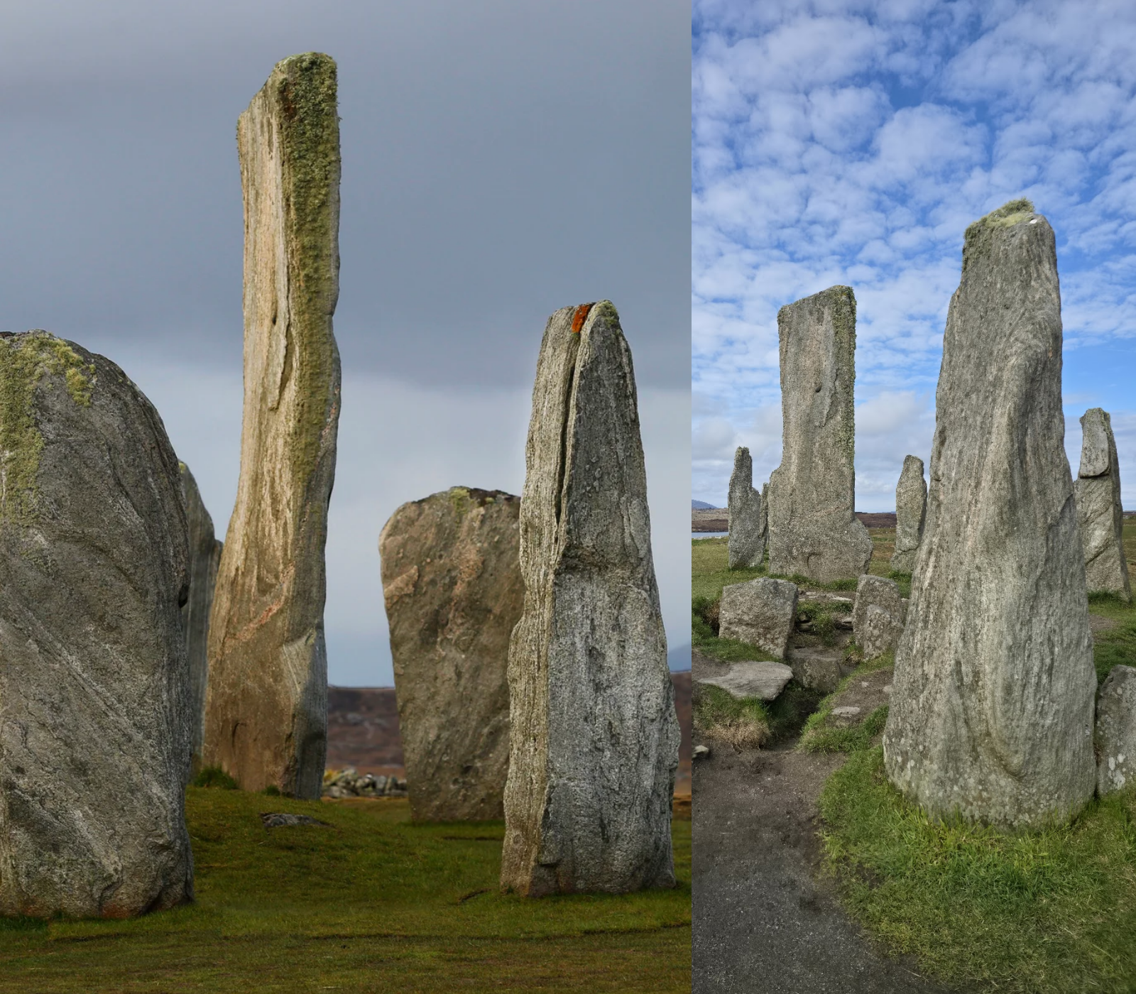 Far to the north, another ancient marvel stands quietly against the windswept landscapes of Scotland. The Callanish Standing Stones form a dramatic circular arrangement of towering monoliths erected around 3000 BCE.