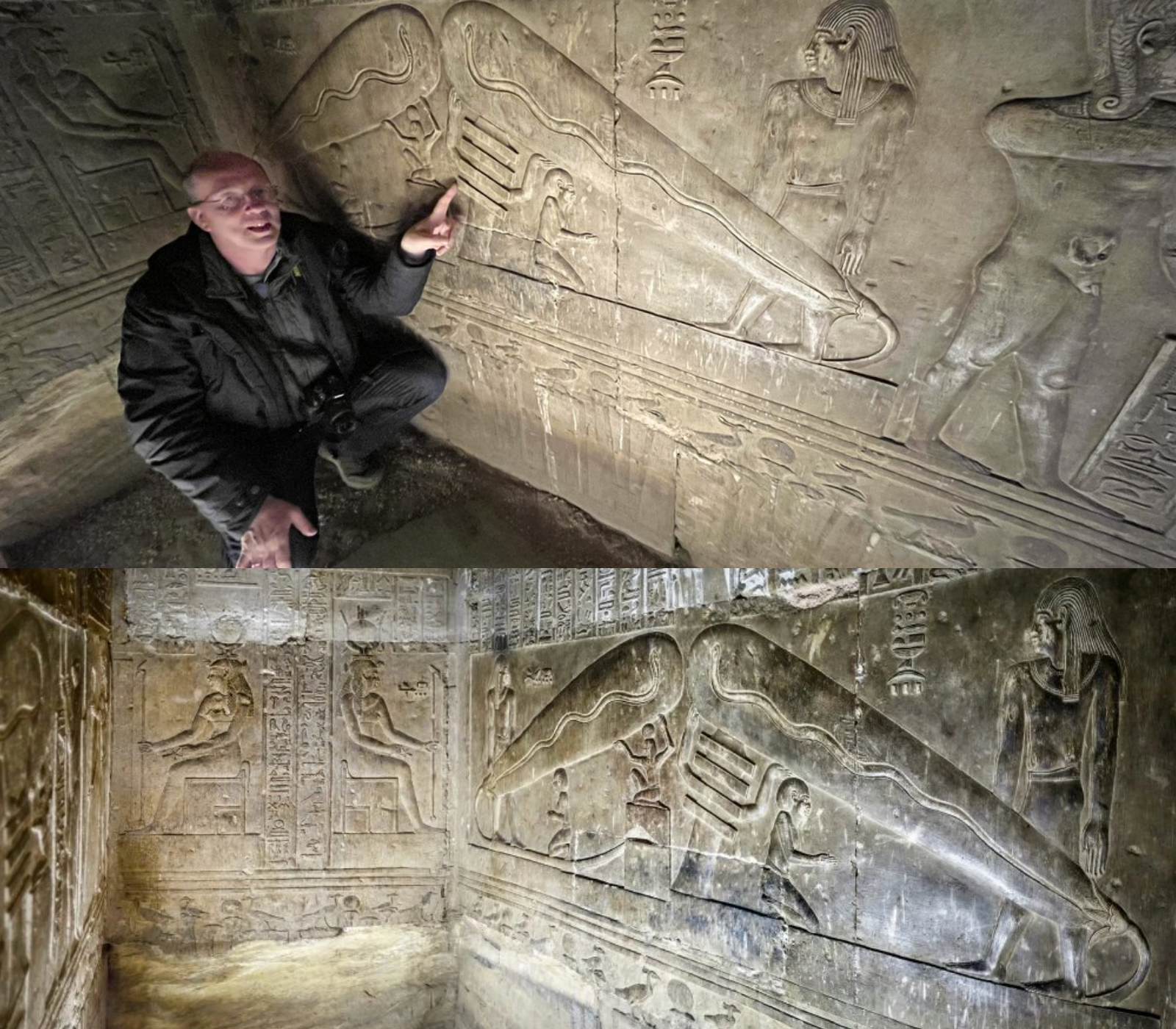 Most Egyptologists, however, interpret the carvings as symbolic religious imagery, representing a lotus flower giving birth to a sacred serpent, a motif linked to creation myths and divine energy.