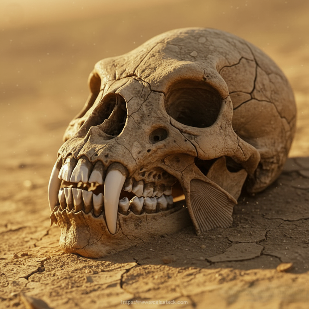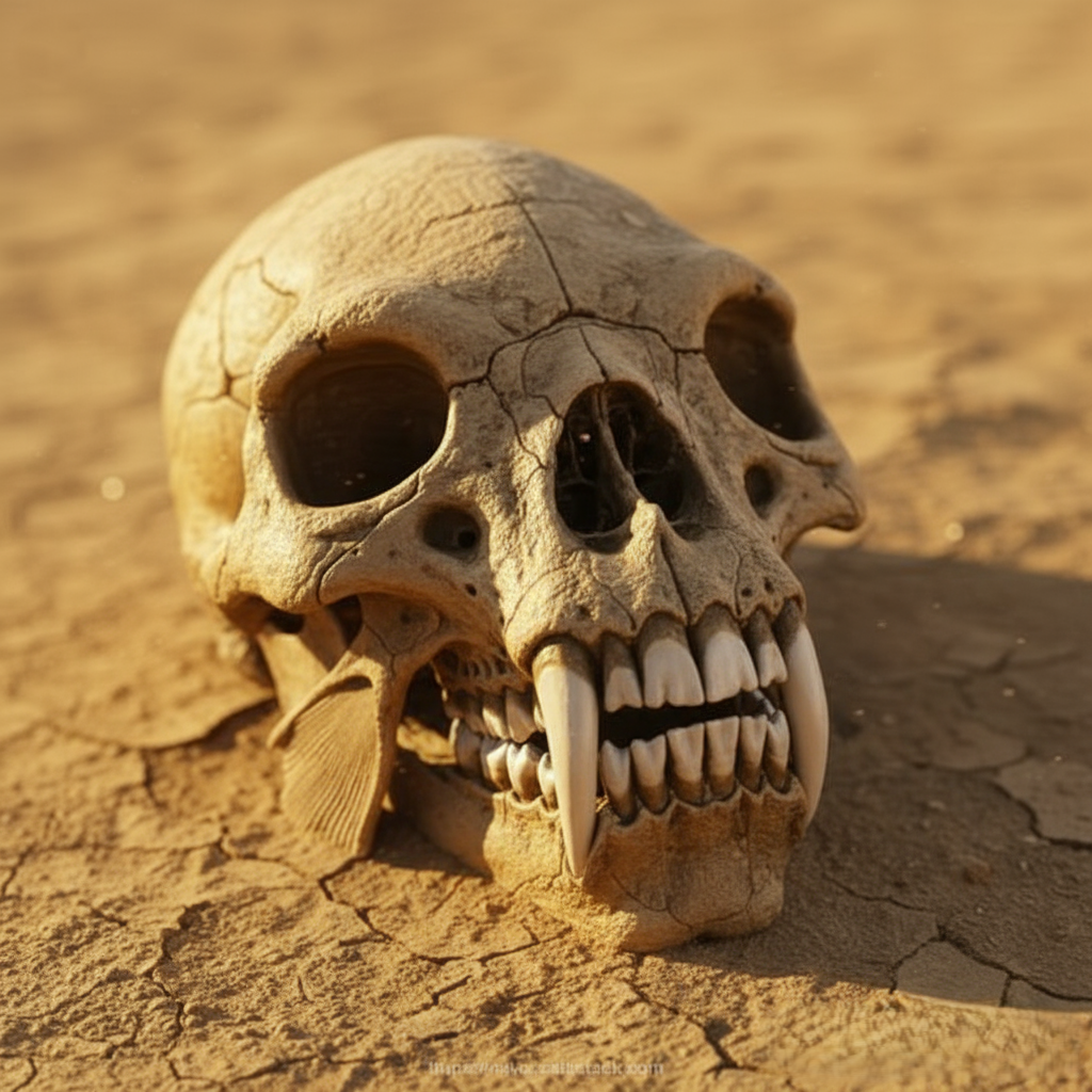 A team of archaeologists has unearthed a skull deep within a barren desert that defies all conventional understanding of human evolution. The fossilized remains display an uncanny blend of human and predatory characteristics — a humanoid cranial shape fused with elongated fangs, reinforced jawbones, and bone density far beyond that of modern Homo sapiens. Preliminary scans reveal an internal structure inconsistent with any known species, suggesting possible cross-genetic origins or engineered alteration.
