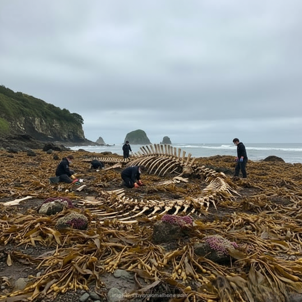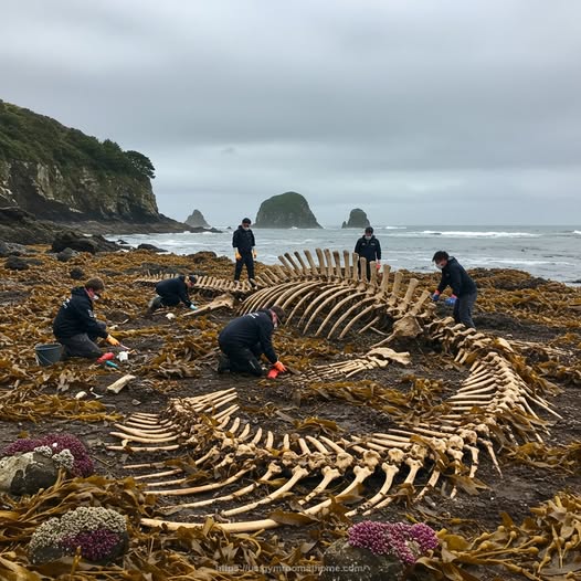 Along a fog-shrouded stretch of coastline rarely touched by humans, archaeologists have stumbled upon the colossal remains of an unidentified sea creature, sending shockwaves across the scientific world. The skeleton, partially buried in wet sand and seaweed, measures nearly forty meters in length, its ribcage towering like the framework of a sunken ship. Experts confirm that the bone density and skeletal structure do not correspond to any known species of whale, fish, or marine reptile. Some fragments exhibit serrated formations and spines reminiscent of deep-sea predators long believed extinct.