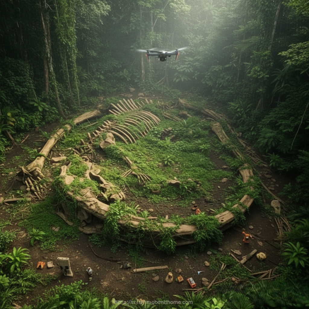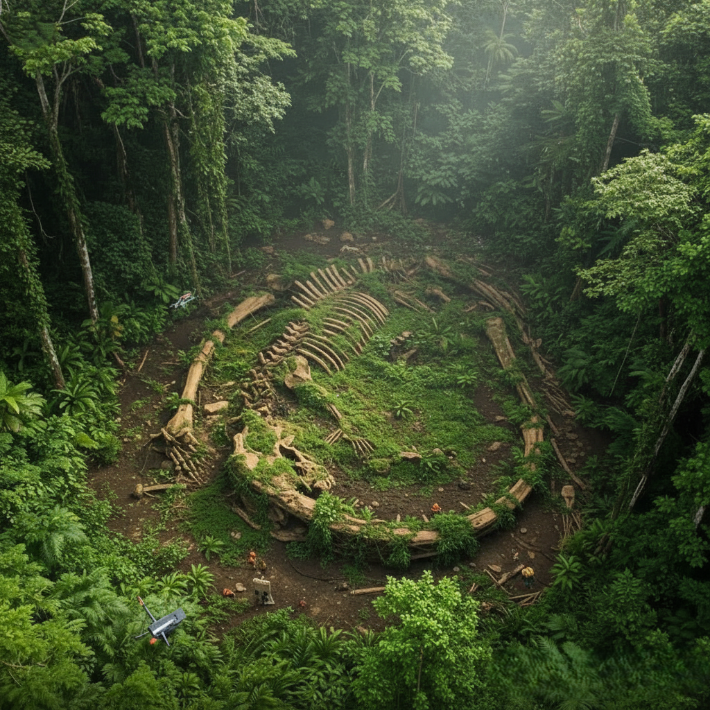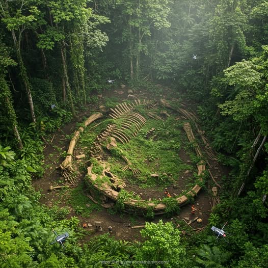 Deep within an uncharted stretch of tropical rainforest, researchers have uncovered what could be one of the most astounding archaeological finds in modern history — the colossal skeleton of an unknown creature, partially entombed within a crater overgrown with vines and moss-covered ruins. The remains, measuring an astonishing sixty meters in length, lie intertwined with fragments of ancient stone architecture carved with indecipherable symbols. Preliminary aerial footage reveals the skeleton’s proportions to be neither entirely animal nor human — its massive ribcage and elongated limbs hint at a form that defies biological classification.