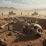 Deep within an uncharted stretch of tropical rainforest, researchers have uncovered what could be one of the most astounding archaeological finds in modern history — the colossal skeleton of an unknown creature, partially entombed within a crater overgrown with vines and moss-covered ruins. The remains, measuring an astonishing sixty meters in length, lie intertwined with fragments of ancient stone architecture carved with indecipherable symbols. Preliminary aerial footage reveals the skeleton’s proportions to be neither entirely animal nor human — its massive ribcage and elongated limbs hint at a form that defies biological classification.