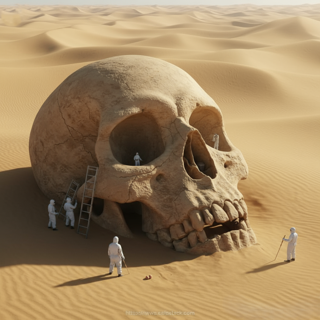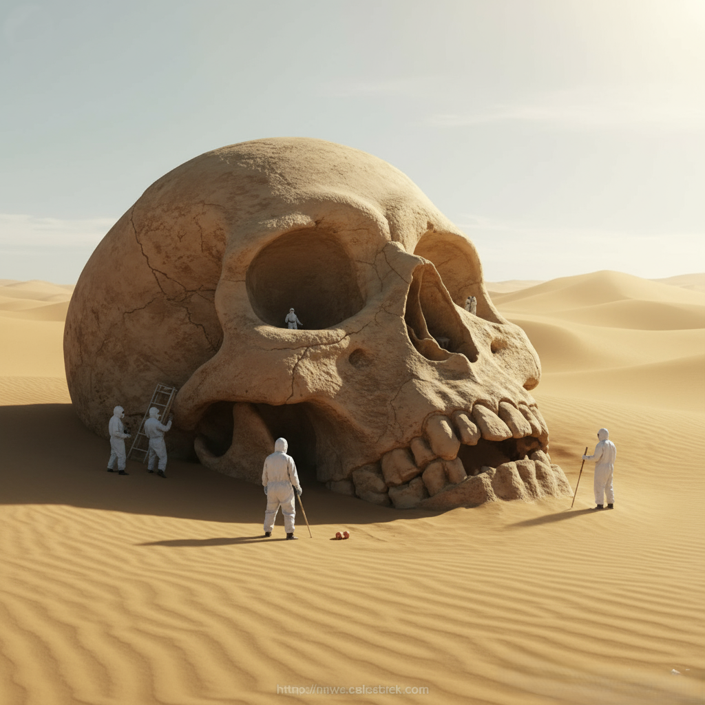 An archaeological team operating in a remote desert basin has uncovered what may be the largest humanoid skull ever discovered, measuring nearly four meters from crown to jaw. The fossilized remains, partially encased in sedimentary rock, display bone density and cranial expansion far beyond any recorded hominid species. Photographs leaked from the site show scientists dwarfed beside the skull’s structure, its vast eye sockets and pronounced jawline resembling something both human and impossibly alien.