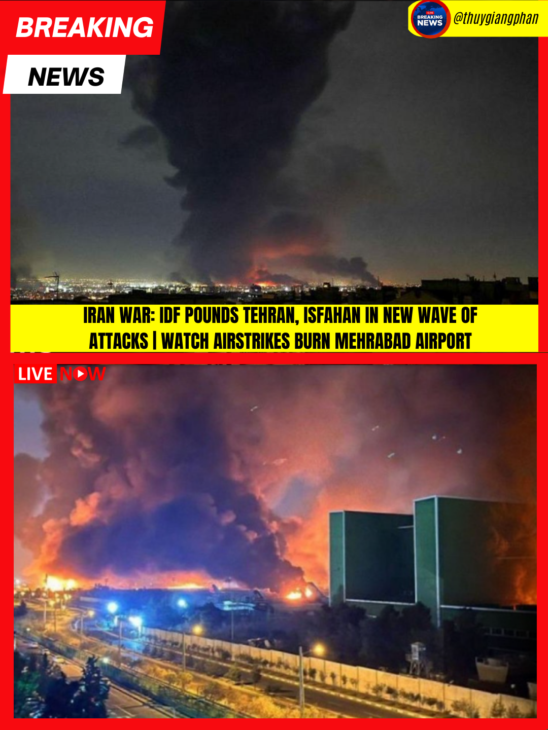 The Israeli Defense Forces (IDF) have launched a massive new wave of airstrikes targeting key sites in Tehran and Isfahan, focusing on regime military infrastructure and strategic installations across central Iran. Explosions have rocked the Iranian capital, with fires visibly engulfing Mehrabad International Airport and surrounding military zones as precision munitions struck runways and hangars. Iranian air defenses responded with anti-aircraft fire, but reports indicate limited success in intercepting the incoming aircraft.