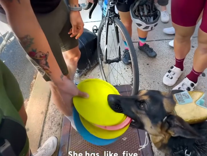 Passersby often stop in their tracks, laughing or staring in amazement at the dog proudly walking by with what looks like a rainbow tower of frisbees clamped in her mouth. Some pull out their phones to capture the moment, while others simply smile at the joyful scene unfolding in front of them. But Lexi seems completely unfazed by the attention.