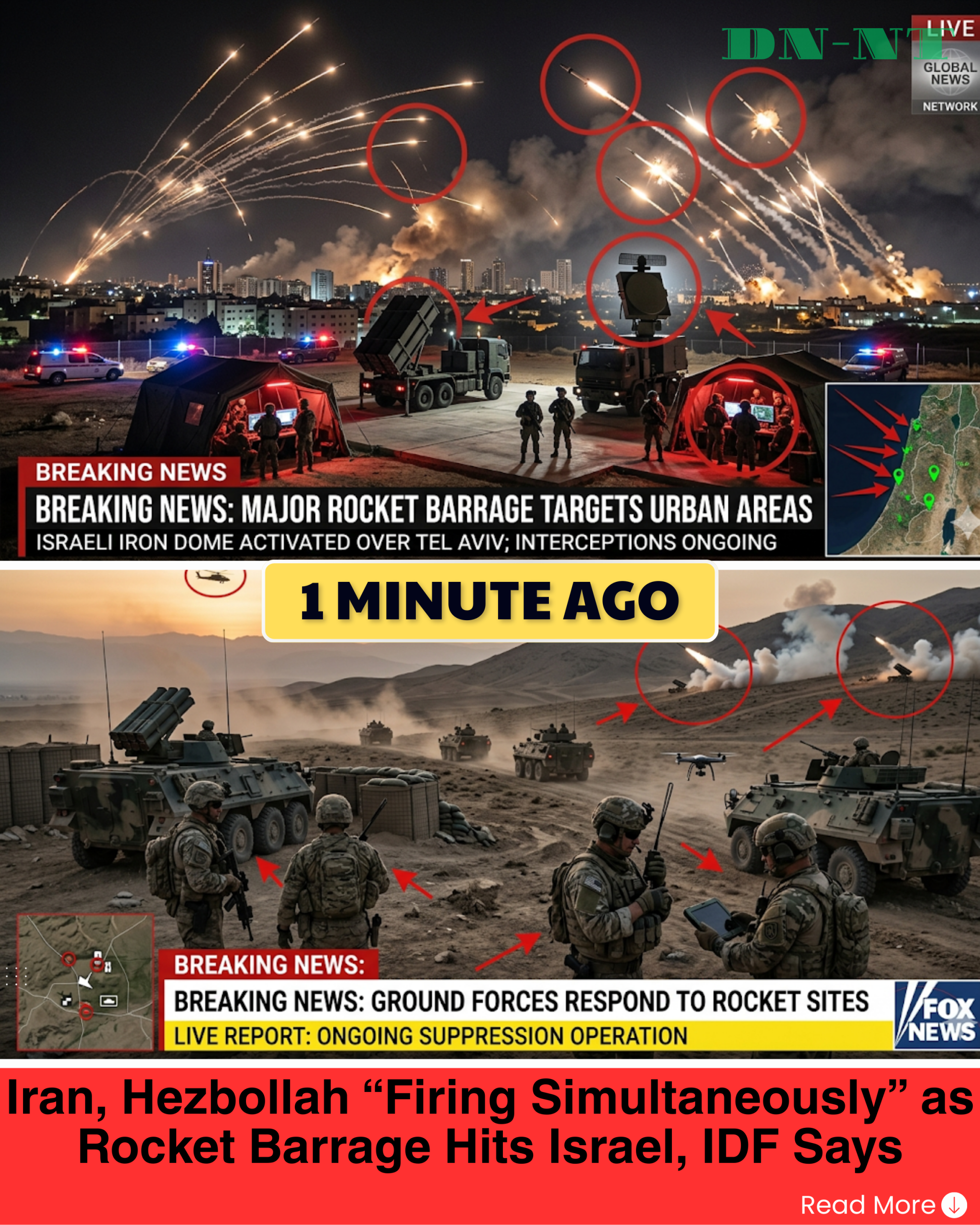 Hezbollah is believed to have fired large rocket barrages from Lebanon, while Iranian missile launches were also detected around the same timeframe. Analysts warn that simultaneous attacks from multiple fronts could challenge even advanced defense networks and increase risks for civilian areas. Israeli forces have responded with airstrikes targeting launch sites and related infrastructure, as regional tensions continue to intensify.
