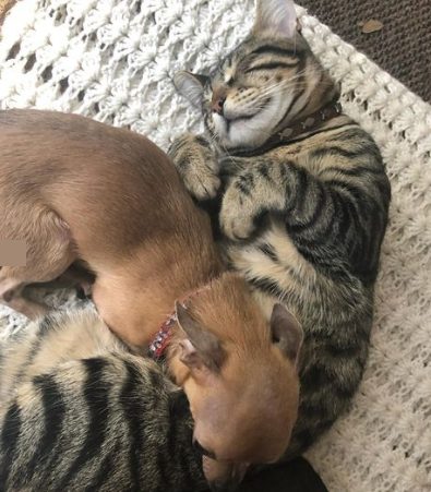 Dude lives with a family cat, forming a relationship that’s equal parts cooperation and playful chaos. When Dude doesn’t want to play, he teases the cat by running around or stealing its toys. But by day’s end, the two snuggle peacefully, creating moments so heartwarming that anyone watching can’t help but smile.