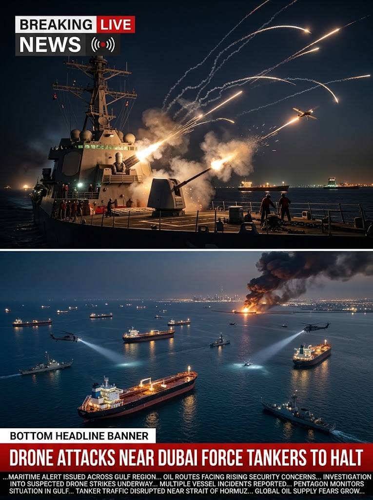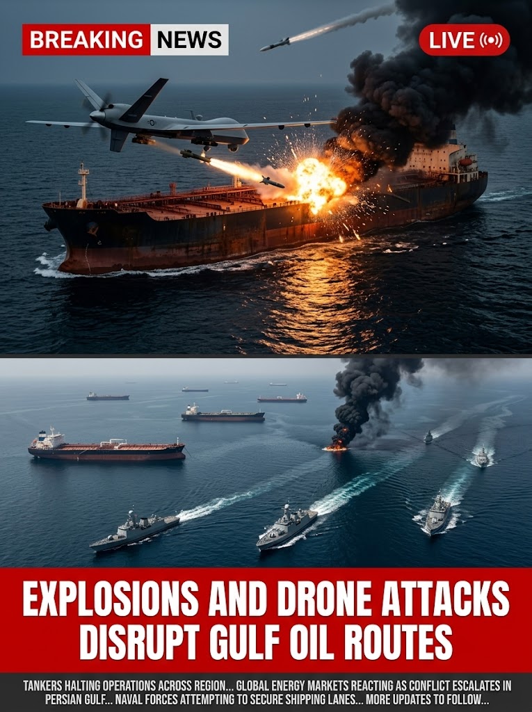 Explosions and suspected drone attacks have disrupted major oil shipping routes in the Gulf near Dubai, forcing several tankers to halt operations and raising concerns about the security of one of the world’s most important energy corridors. The incidents were reported along maritime routes used by commercial vessels transporting crude oil from the Middle East to global markets, prompting immediate alerts from maritime security authorities and shipping companies operating in the region.