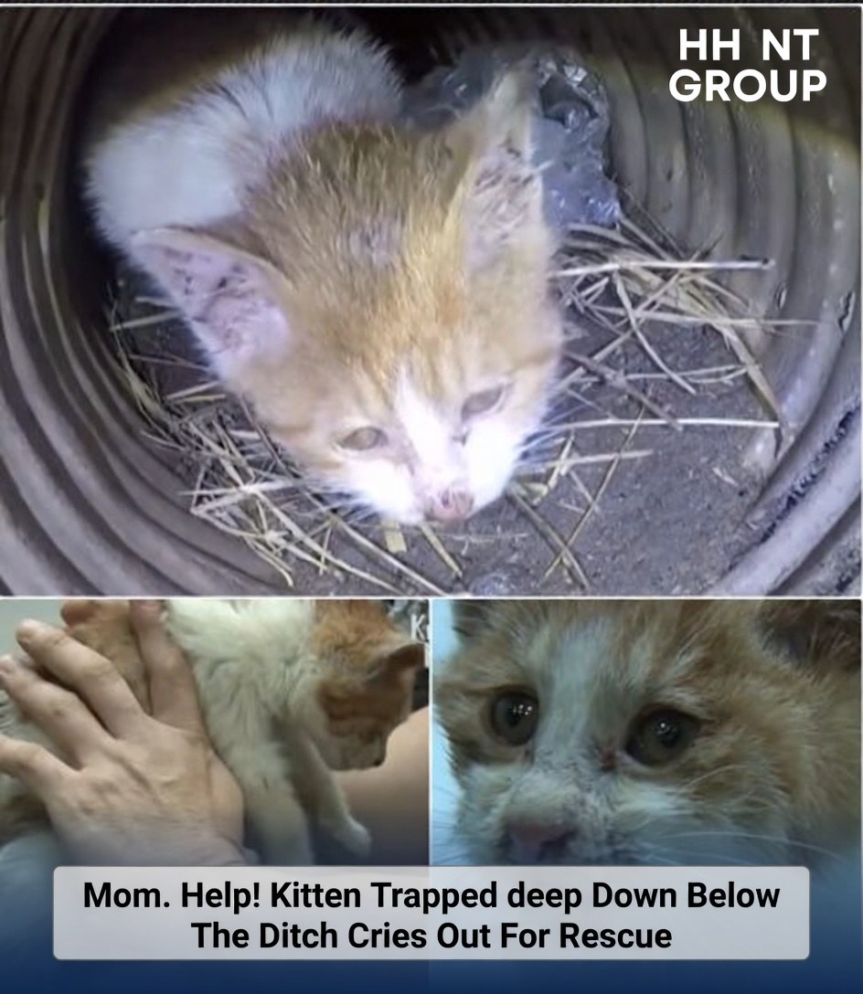 From the dark, damp depths of a concrete ditch, a tiny, piercing voice echoes—a desperate plea for help that breaks the silence of the neighborhood. A stray kitten, barely weeks old, has tumbled into a narrow drainage pipe, trapped far below the surface where no mother’s reach can go.