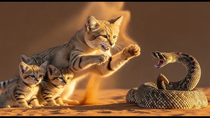 Deep in the rolling dunes, a “silent assassin”—a massive rattlesnake—slithered toward a hidden burrow. Inside, three tiny Sand Cat kittens were “buried” in sleep, completely unaware of the venomous threat. But the snake made a fatal mistake: it underestimated the ferocity of a mother.