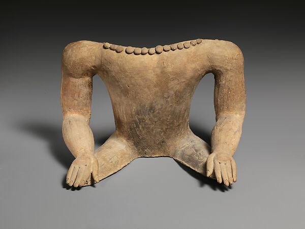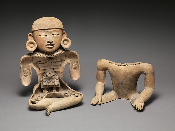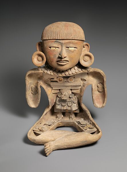 This sculpture depicts a seated male figure with crossed legs and hands resting on his knees. It features a removable chest plate that reveals small mold-made figurines and medallions attached inside the hollow body. The main figure is nude except for a broad collar made of circular appliqués and large earflares. Traces of red pigment show that it was once vividly painted, and remnants of pyrite indicate that the eyes were originally inlaid with this reflective mineral. His distinct hairstyle is neatly incised—a row of short bangs framing the face and longer strands falling to the shoulders at the back.