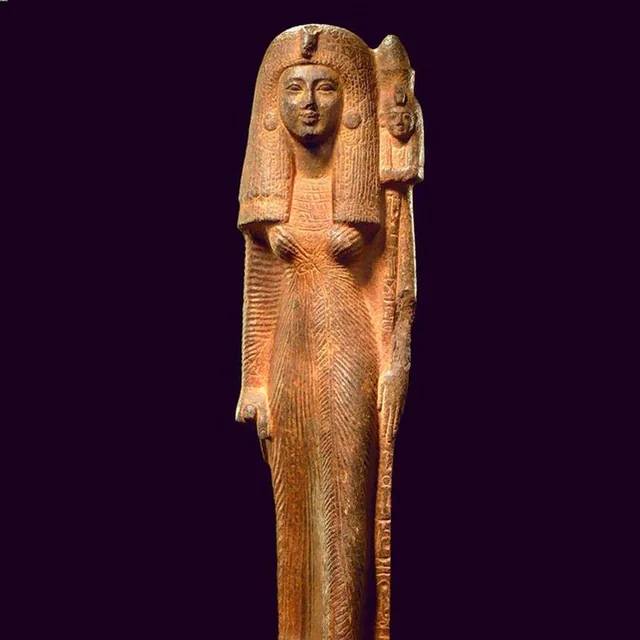 This sculpture depicts a standard topped with a bust of the goddess Mut, wearing a striated wig adorned with a uraeus and the Double Crown of Upper and Lower Egypt. The surfaces of Mut and Queen Nefertari’s flesh are highly polished, creating a striking contrast with the matte texture of the wigs and garments. The shaft of the standard bears a hieroglyphic inscription that reads: