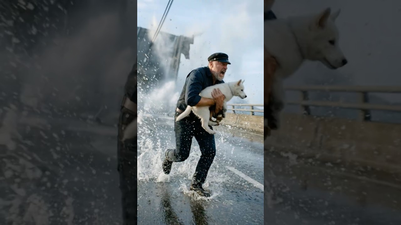 As the roadway around them began to crumble and collapse, the man and the puppy ran, with the waves crashing dangerously close. Just as the water reached them, the man placed the puppy safely on solid ground on the other side of the bridge. But the danger was far from over. With a final push of strength, the man climbed up after the puppy, narrowly escaping the destructive force of the tsunami.