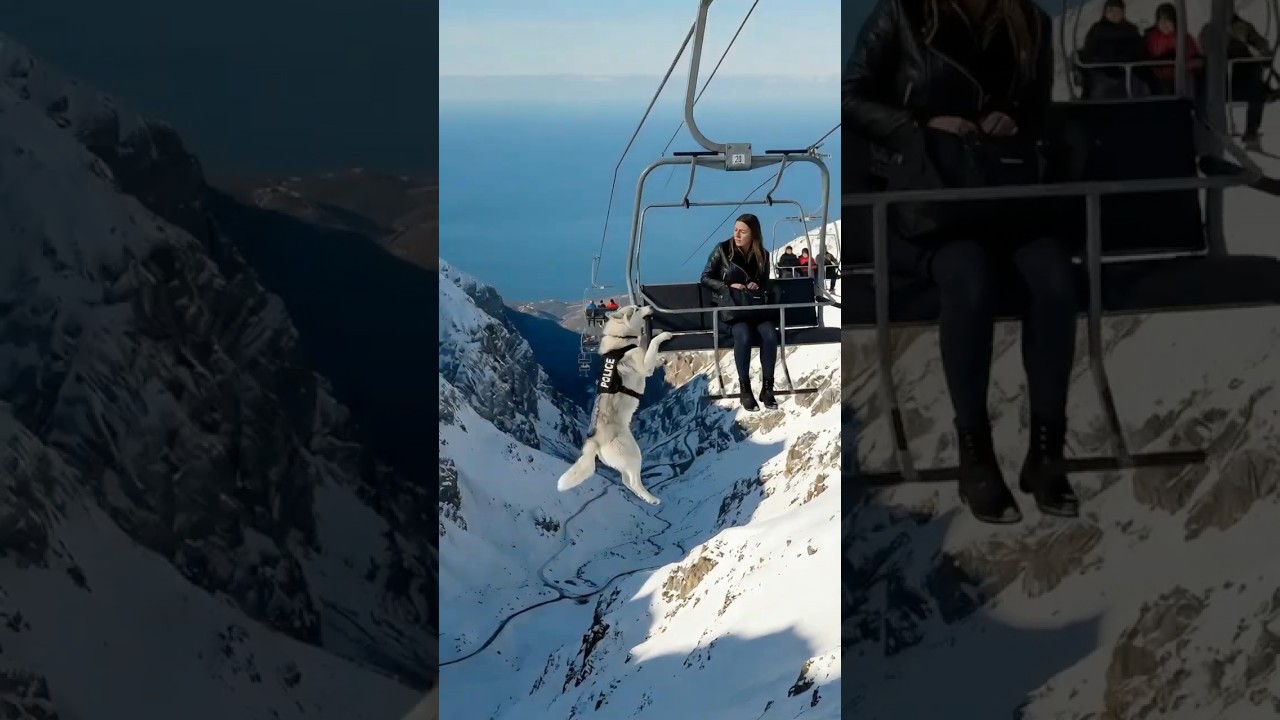 Without a second thought, the brave Husky sprang into action. Ignoring the icy winds and the steep mountain terrain, the dog leaped from the mountain terminal, its powerful legs propelling it toward the moving lift. With incredible agility, the Husky grabbed onto the lift, hanging on with all its might, determined to stop the impending disaster.