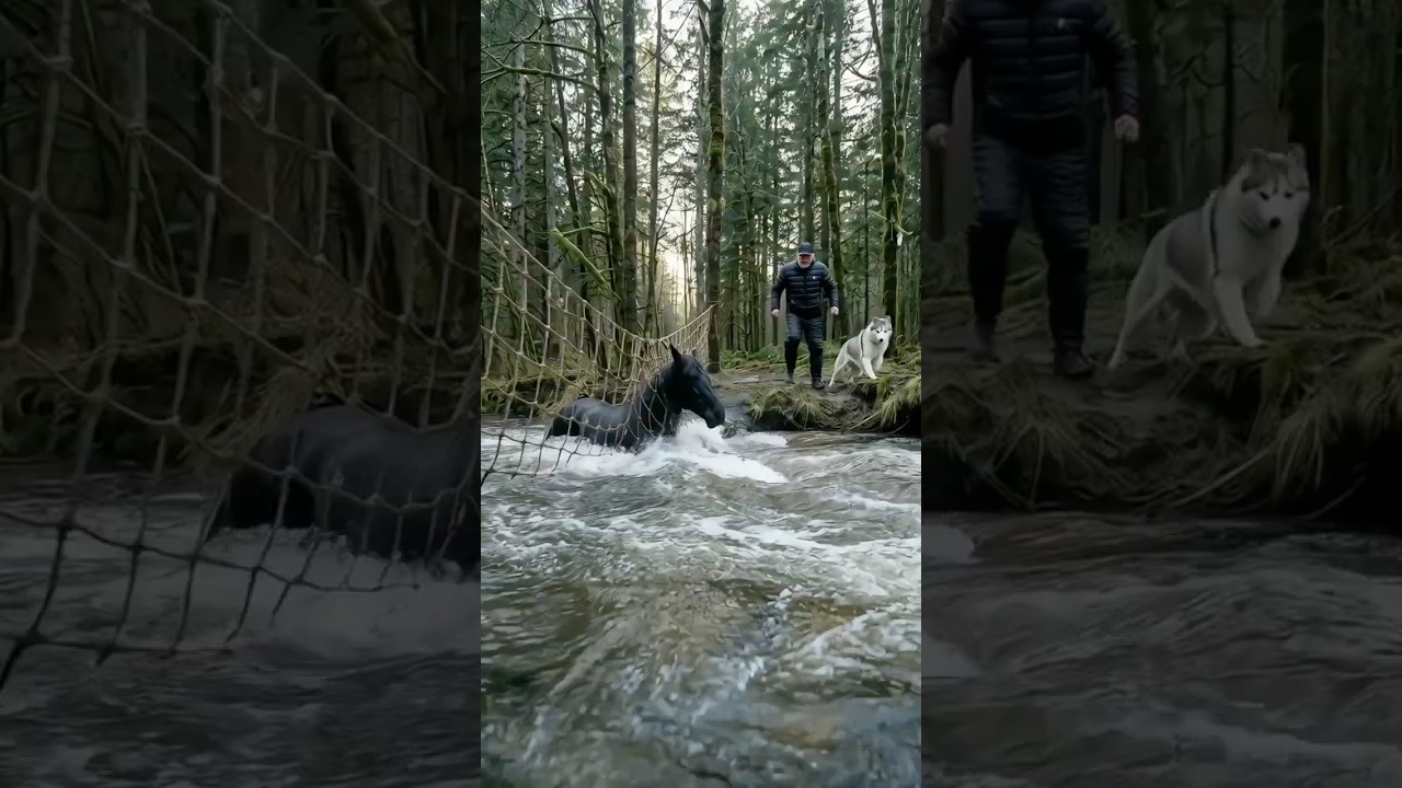 But fate had something else in store for the struggling animal. Nearby, a brave Husky noticed the horse’s plight, its sharp eyes recognizing the danger. Without hesitation, the courageous dog sprinted toward the riverbank, barking urgently at the trapped horse. The Husky tried desperately to pull at the ropes, using its teeth and paws, but the net was too tangled and strong for the dog to loosen.