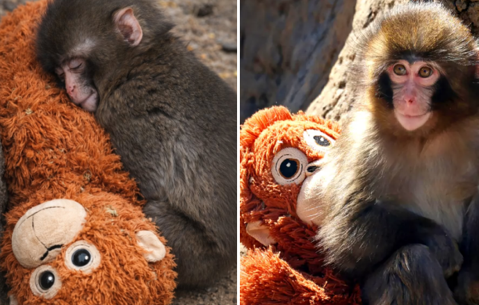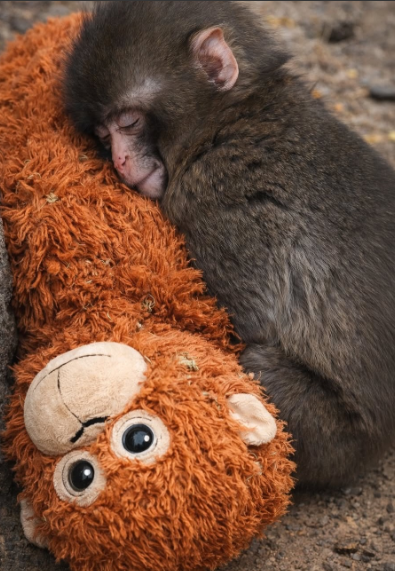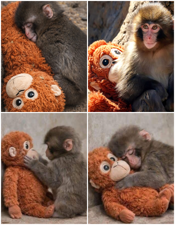 Little Punch, a tiny Japanese macaque who had been abruptly separated from his mother during a routine relocation at the zoo, found himself plunged into a world of fear and isolation that left him trembling and withdrawn for days. Zookeepers noticed the young primate’s distress immediately and decided to introduce a simple soft stuffed toy into his enclosure as a temporary source of comfort, never expecting the profound impact it would have on his emotional recovery. The baby monkey latched onto the plush companion with remarkable intensity, treating it as a surrogate for the maternal warmth and security he had lost, and over the following weeks his anxious behaviors gradually diminished as he began to regain confidence in his surroundings.