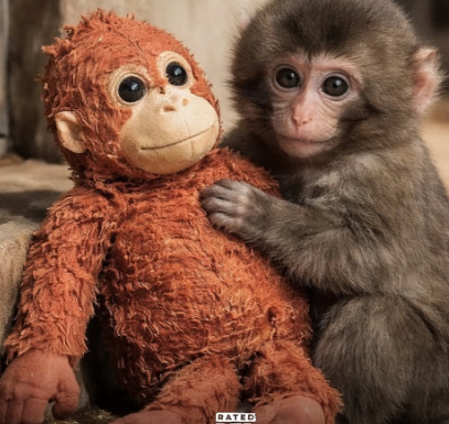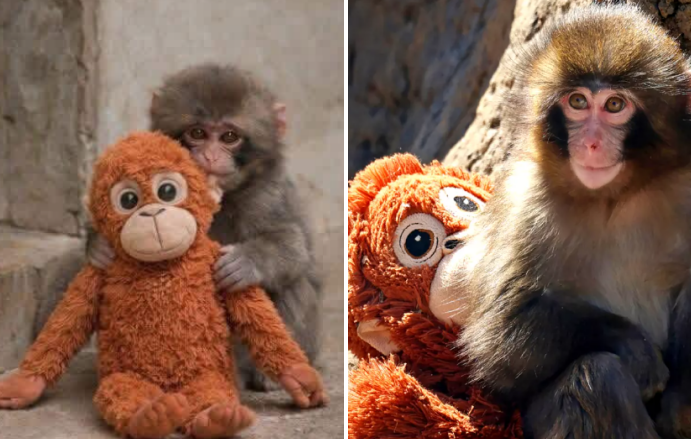 The stuffed toy soon became far more than a simple object for Little Punch; it represented safety and familiarity in an otherwise frightening new environment, allowing him to gradually rebuild his confidence and venture out to explore the enclosure without constant fear. Keepers documented every stage of his recovery, noting how the toy helped him transition from isolation to tentative social engagement with other young macaques in the group. This carefully chosen intervention proved to be the turning point that enabled the baby monkey to overcome the deep emotional trauma of separation and start forming new bonds that would support his long-term development.