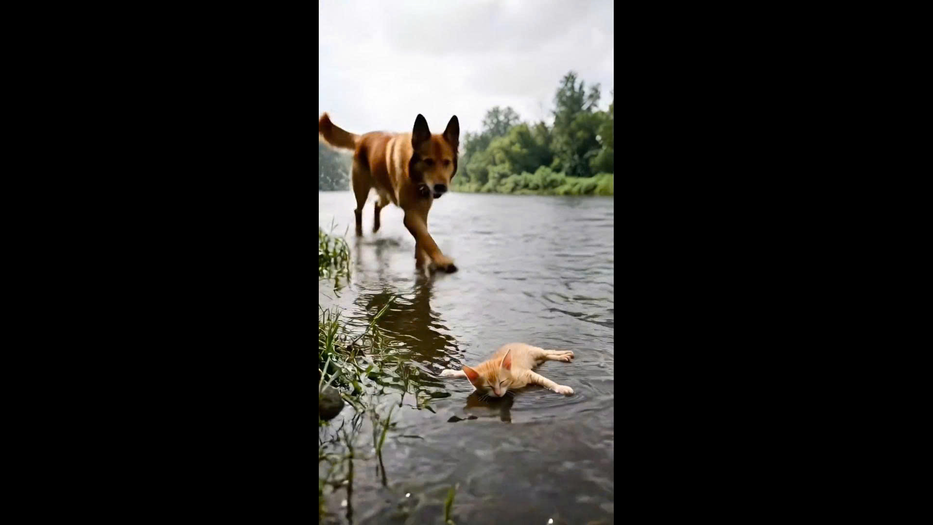 In a dramatic rescue amidst the pouring rain, a brave dog becomes an unlikely hero, pulling a tiny kitten from a raging river. The kitten, helpless and struggling against the strong current, was moments away from disaster. But the dog, driven by instinct and compassion, jumps into action, grabbing the kitten with his teeth and carrying it to safety.