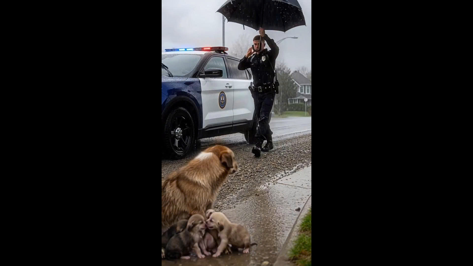 In a beautiful act of compassion, the officer opened his umbrella, sharing the small amount of cover with the struggling family. With simple kindness, he gave them the warmth and protection they desperately needed in that stormy moment. The puppies, once trembling in the rain, were now surrounded by love and care.
