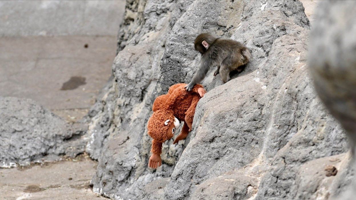 For this little monkey, the plush seemed to mean comfort, security, and something familiar enough to trust. He held it tightly, as if the softness in his arms could quiet the uncertainty around him. It looked like a little emotional anchor — something small, but deeply important.