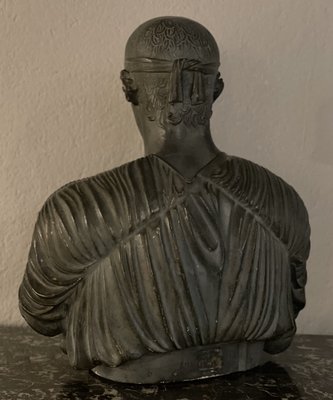 His serene expression, detailed facial features, and the delicate rendering of his draped chiton reflect the transition from the Archaic to the Early Classical style, known as the Severe Style.