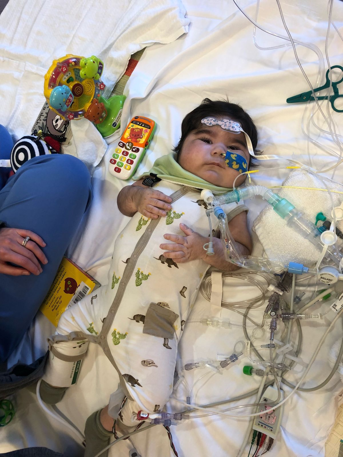 A tiny baby lay on the hospital bed, surrounded by tubes, machines, and quiet beeping sounds—but right beside him were bright toys. A small phone, a spinning rattle, little pieces of childhood scattered like reminders of a world waiting outside.
