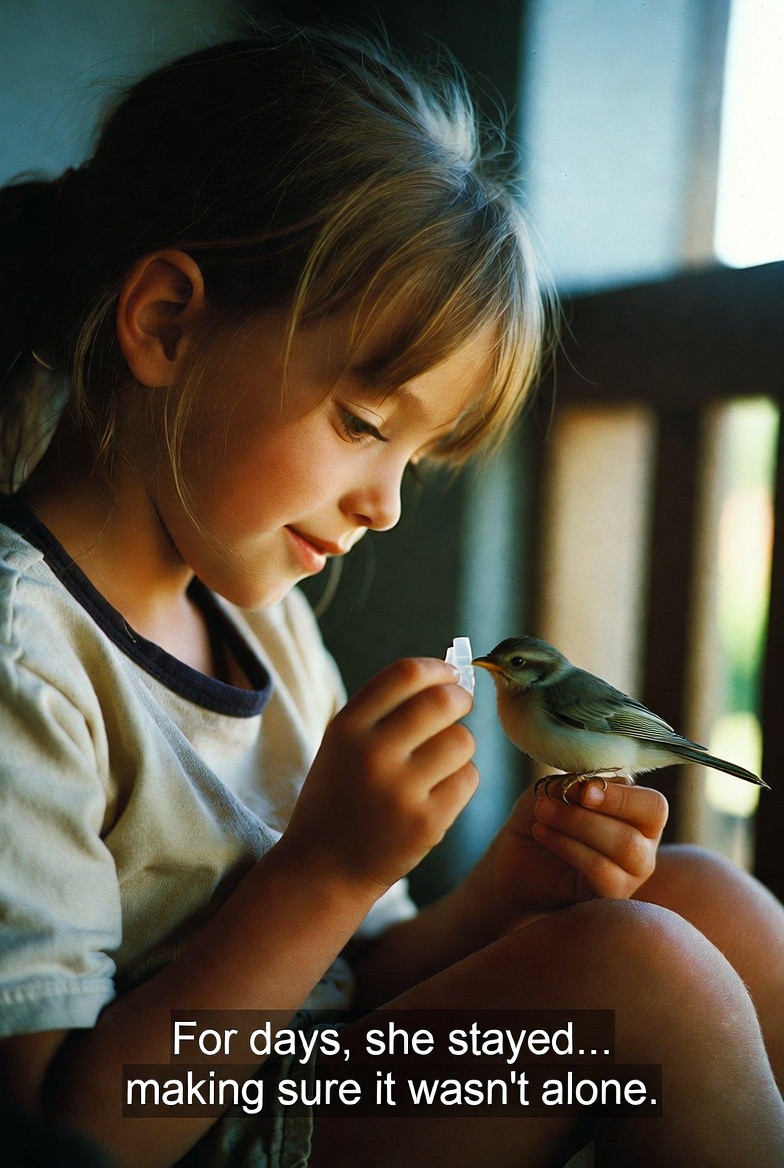 She found the tiny bird on the ground, trembling and barely able to move. Instead of walking past, she carefully picked it up, holding it gently in her small hands as if it were something truly precious.