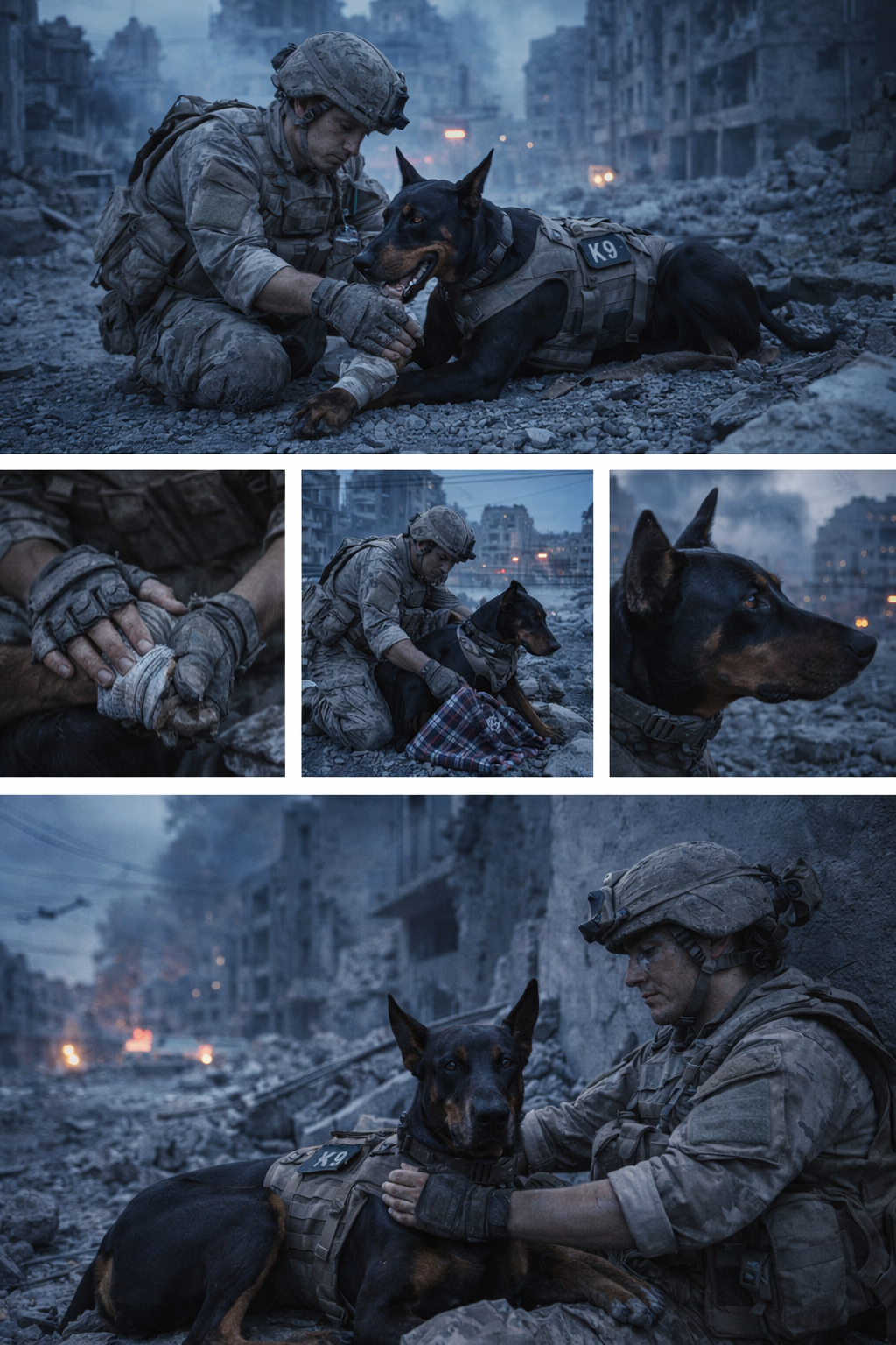 Nilsen removed his gloves just long enough to rub warmth back into Luka’s ear, then wrapped an insulated cloth around the dog’s body while dawn slowly lifted over the frozen camp. Nearby, crates sat half-buried in snow. A shielded heat source flickered low. Breath rose in pale clouds from both soldier and dog.