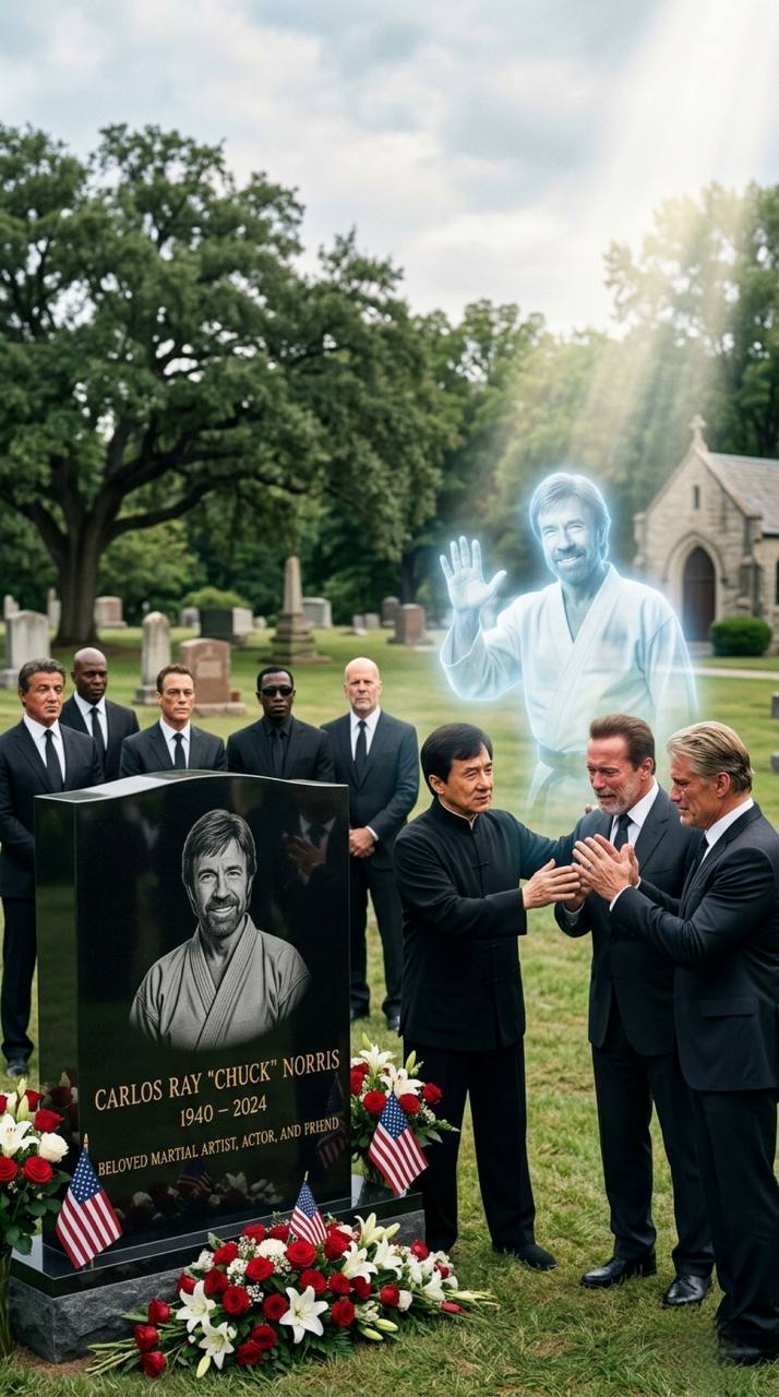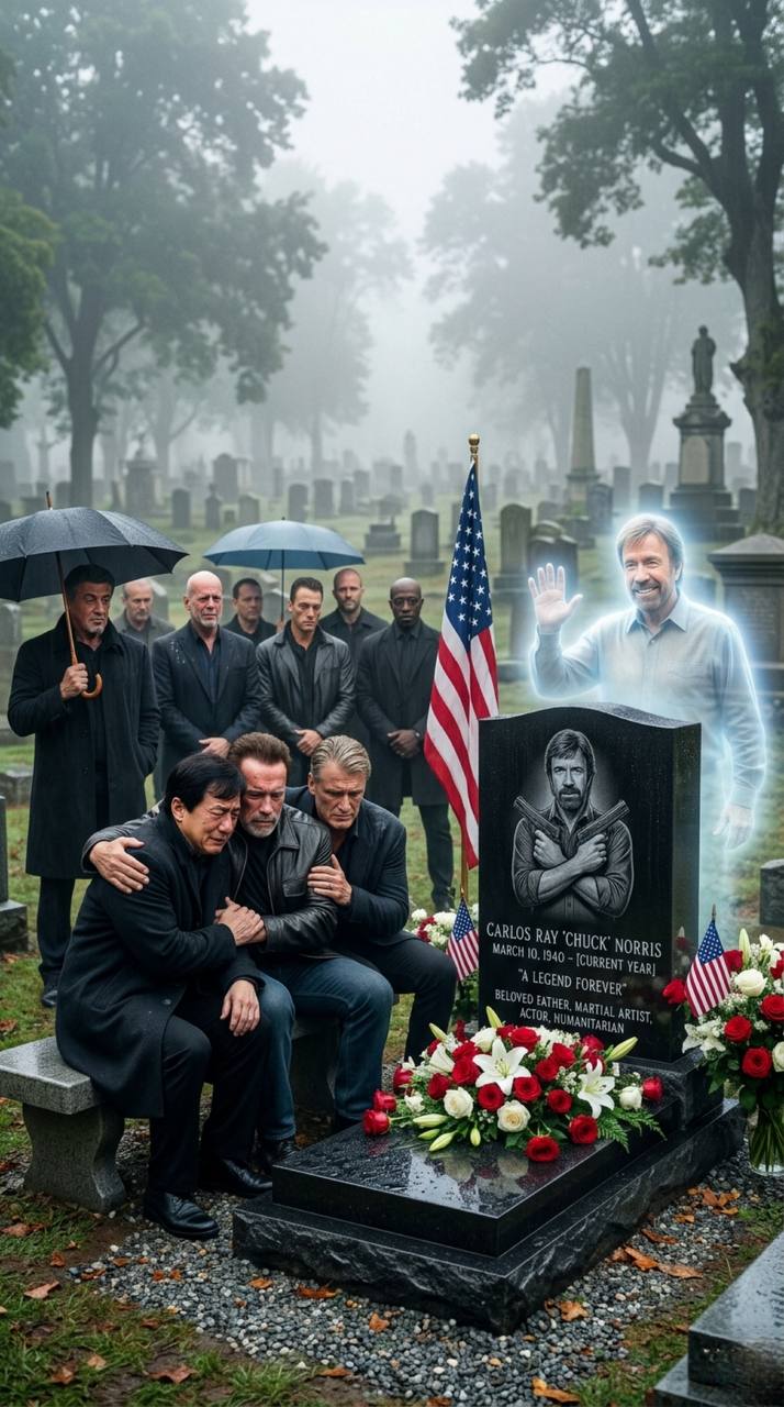 Behind the massive circle, the black marble tombstone “A LEGEND FOREVER” stood watch like a silent guardian, Chuck Norris’ portrait seeming to gaze down upon them all with quiet pride. At that exact moment, Chuck Norris’ glowing blue-white spirit appeared once more — even more vivid and present than before — protective, gentle, and smiling with infinite warmth and understanding. His radiant aura seemed to expand outward, wrapping around every single person in the circle like a final, invisible blessing from beyond, as if he were personally comforting each one and saying, “It’s okay, my friends. I’m still right here with you, forever.”
