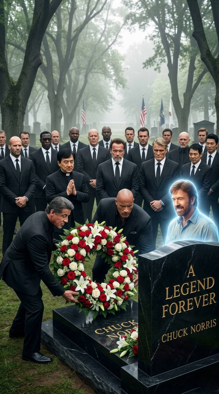 Dolph Lundgren, his towering frame slightly hunched with sorrow, added quietly, “Chuck always said the real strength isn’t in the punch — it’s in the heart behind it. Today we feel that heart surrounding all of us.” The Rock, voice steady yet emotional, nodded and said, “He inspired us to be bigger than ourselves. Today we honor that by standing together as one.” Jason Statham, usually the stoic one, simply tightened his grip and let a single tear fall, his silence speaking louder than words.