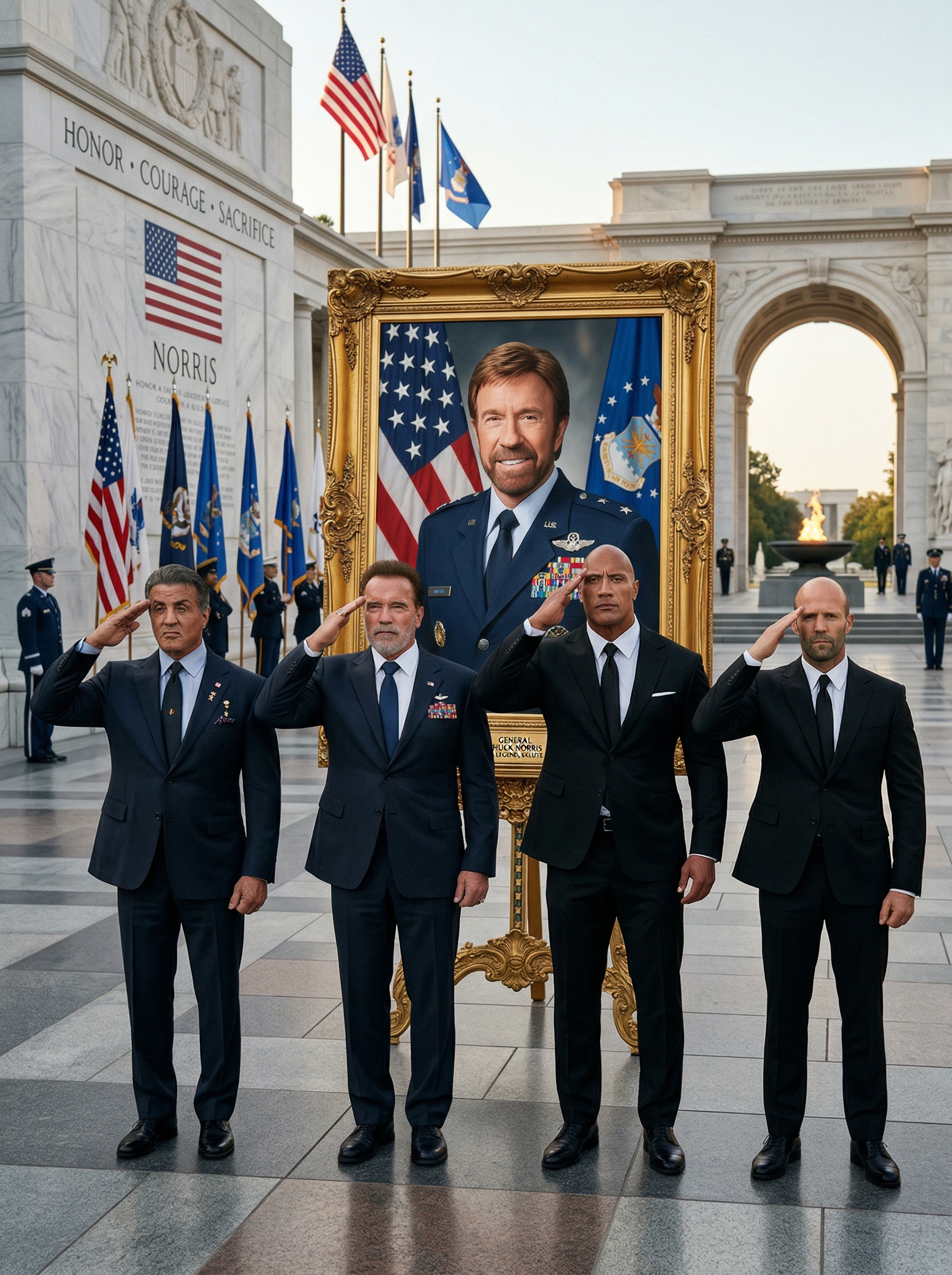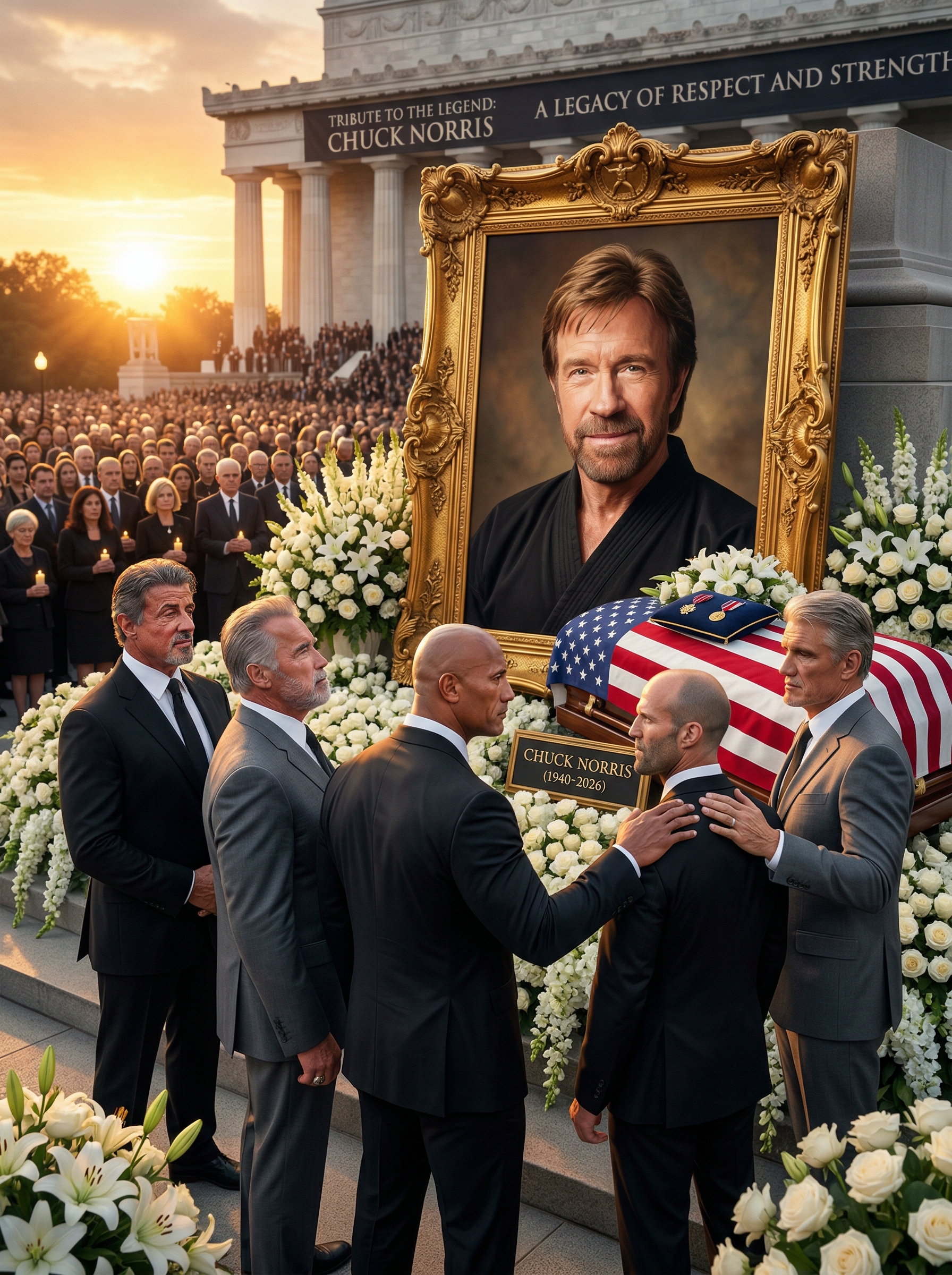 Yet even in the depths of this darkness, glimmers of resilience emerged. As the first golden rays of sunrise pierced the mourning sky the following morning, they gently kissed the rose-covered black marble tomb. The world stood in exhausted, tear-stained silence, witnessing a bittersweet dawn that carried his indomitable spirit into a new day. Chuck Norris had traded his earthly fists for heavenly wings, now watching over humanity with the same protective love, only from above. His unbreakable spirit had divided into billions of pieces, becoming a shield in every grieving heart. A single bright eternal flame danced beside the grave, its light reflecting in the eyes of those who vowed never to let his memory fade. In that undying fire burned the passion he had ignited in all of us—a flame that even death could not extinguish.