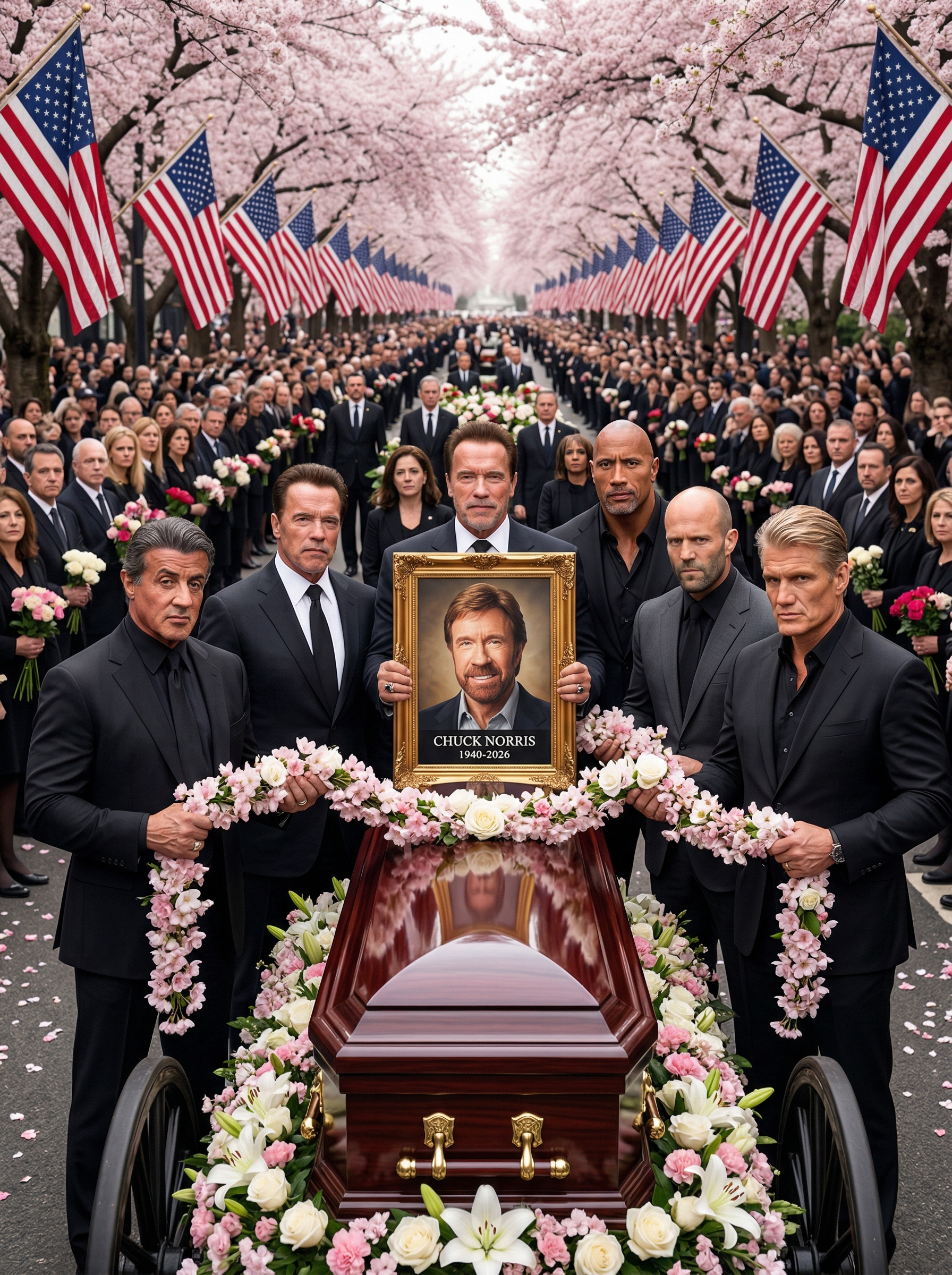 Warriors from every nation converged in a display of global brotherhood that transcended borders and languages. Martial artists stood shoulder to shoulder, fists placed solemnly over their hearts as tears flowed freely. They honored the master who had taught generations to stand tall, to fight with honor, and to protect what mattered most. In this circle of unbreakable yet devastated unity, true legends never truly fall—they simply pass the torch of discipline and love to those who remain. A gentle yet powerful wind swept across the graveyard at that moment, lifting delicate rose petals into the air as if Chuck himself were sending one last empowering message of strength. Legends like him do not die; they become the wind that lifts us all, carrying his indomitable spirit far beyond the confines of this earthly realm.