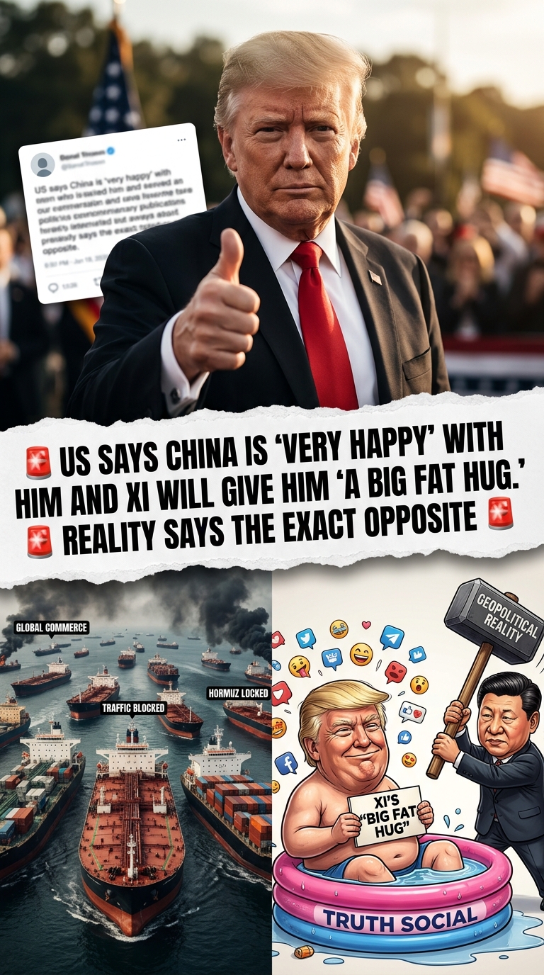 Trump just posted: “China is very happy that I am permanently opening the Strait of Hormuz. I am doing it for them, also — And the World. They have agreed not to send weapons to Iran. President Xi will give me a big, fat, hug when I get there in a few weeks. Doesn’t that beat fighting??? BUT REMEMBER, we are very good at fighting.”
