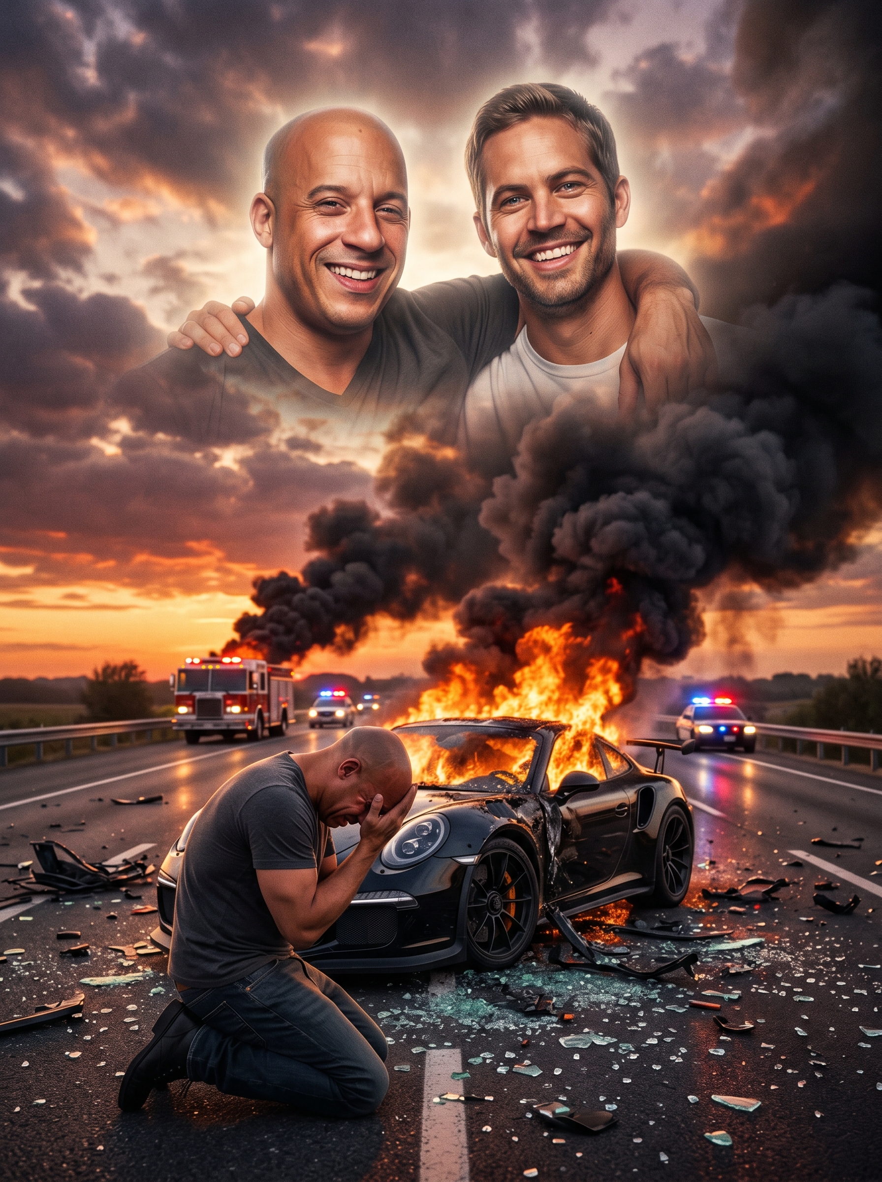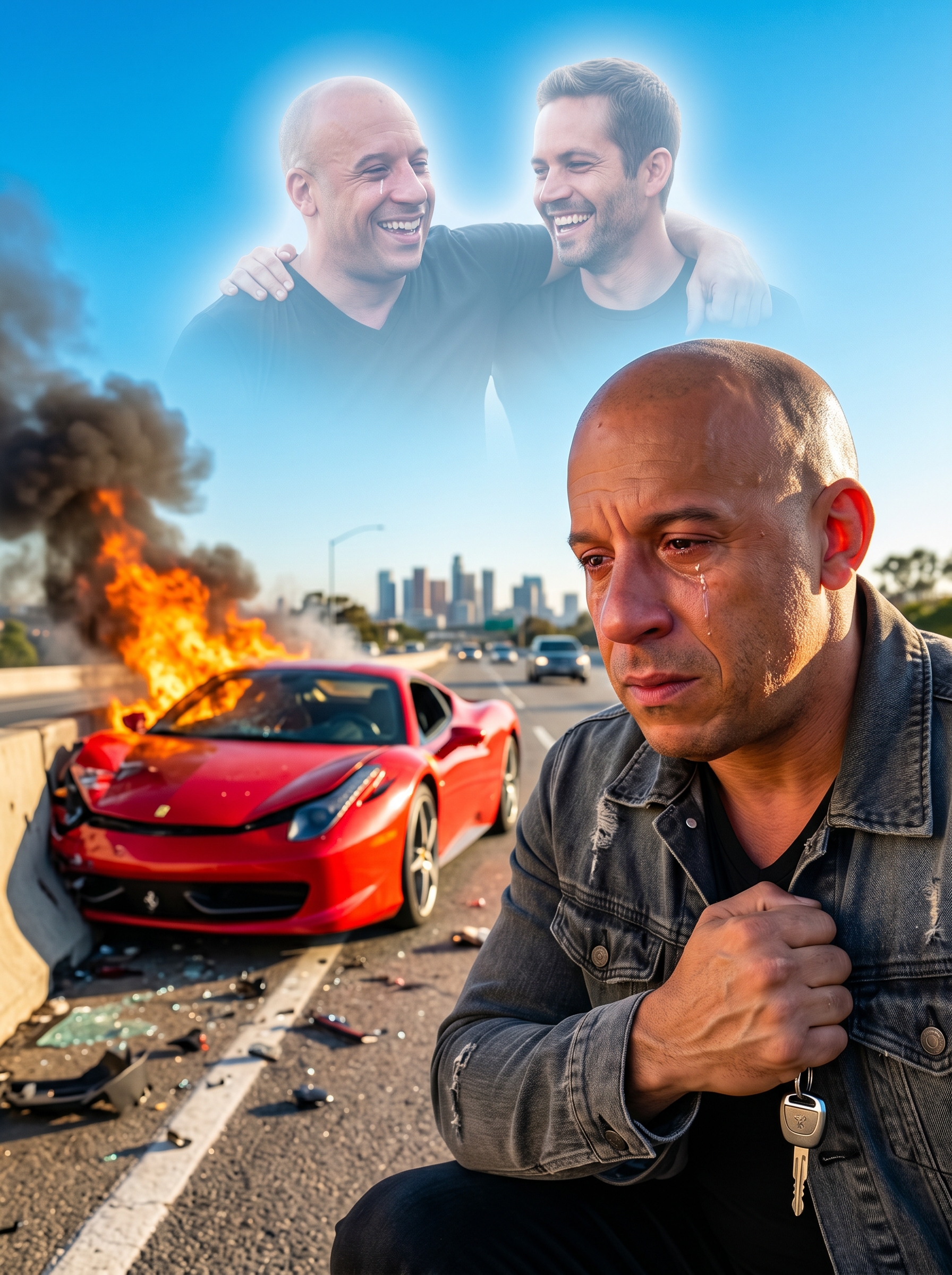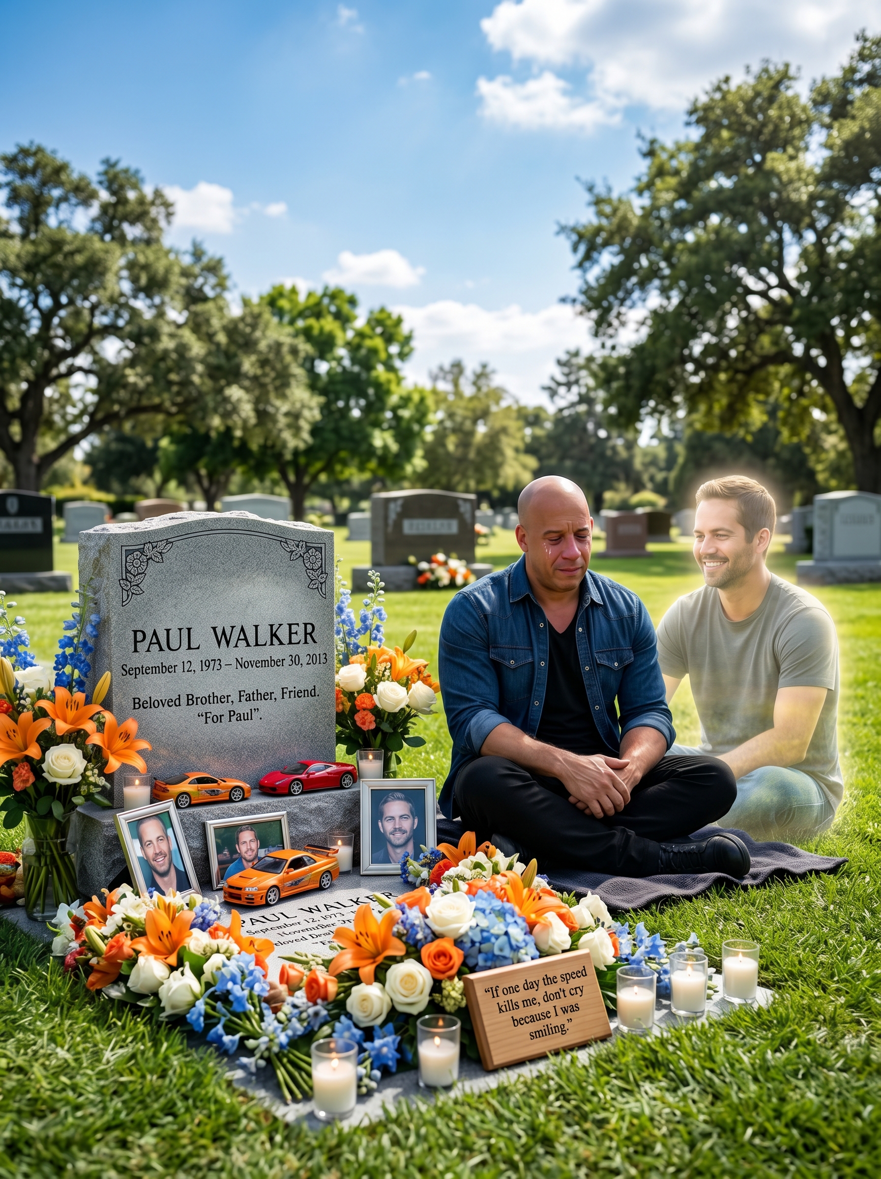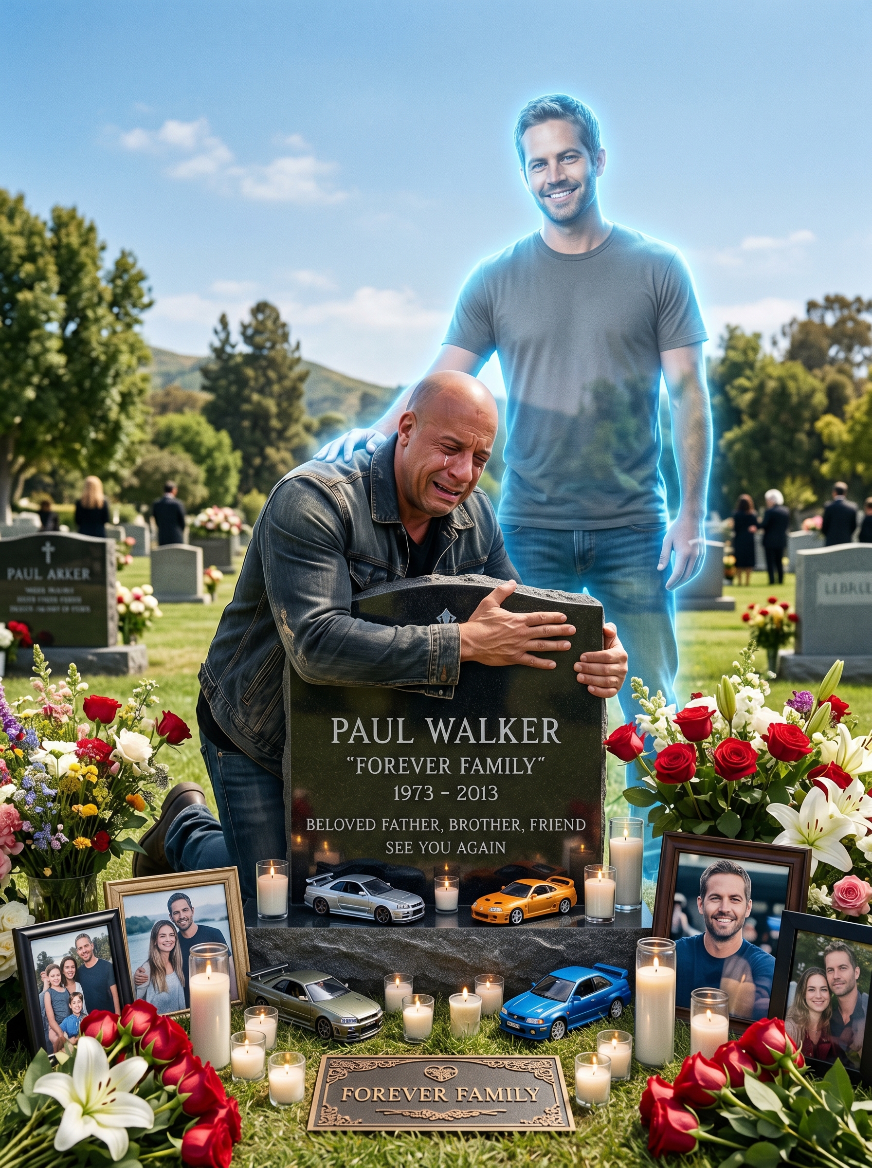 Among those most deeply affected was Vin Diesel, Paul’s on-screen brother and real-life best friend. Reports and eyewitness accounts described Vin arriving at the site days later, his usual unbreakable demeanor shattered. He stood before the growing sea of flowers and tributes, tears streaming down his face as he spoke through a police car loudspeaker to the grieving crowd. His voice cracked. His words were simple yet profound. He thanked every person who had come to honor his brother. He promised that Paul’s spirit would live on in every frame of Furious 7 and in the hearts of the family he left behind. Those who were there that day say Vin looked like a man trying to hold the entire world together with his bare hands.