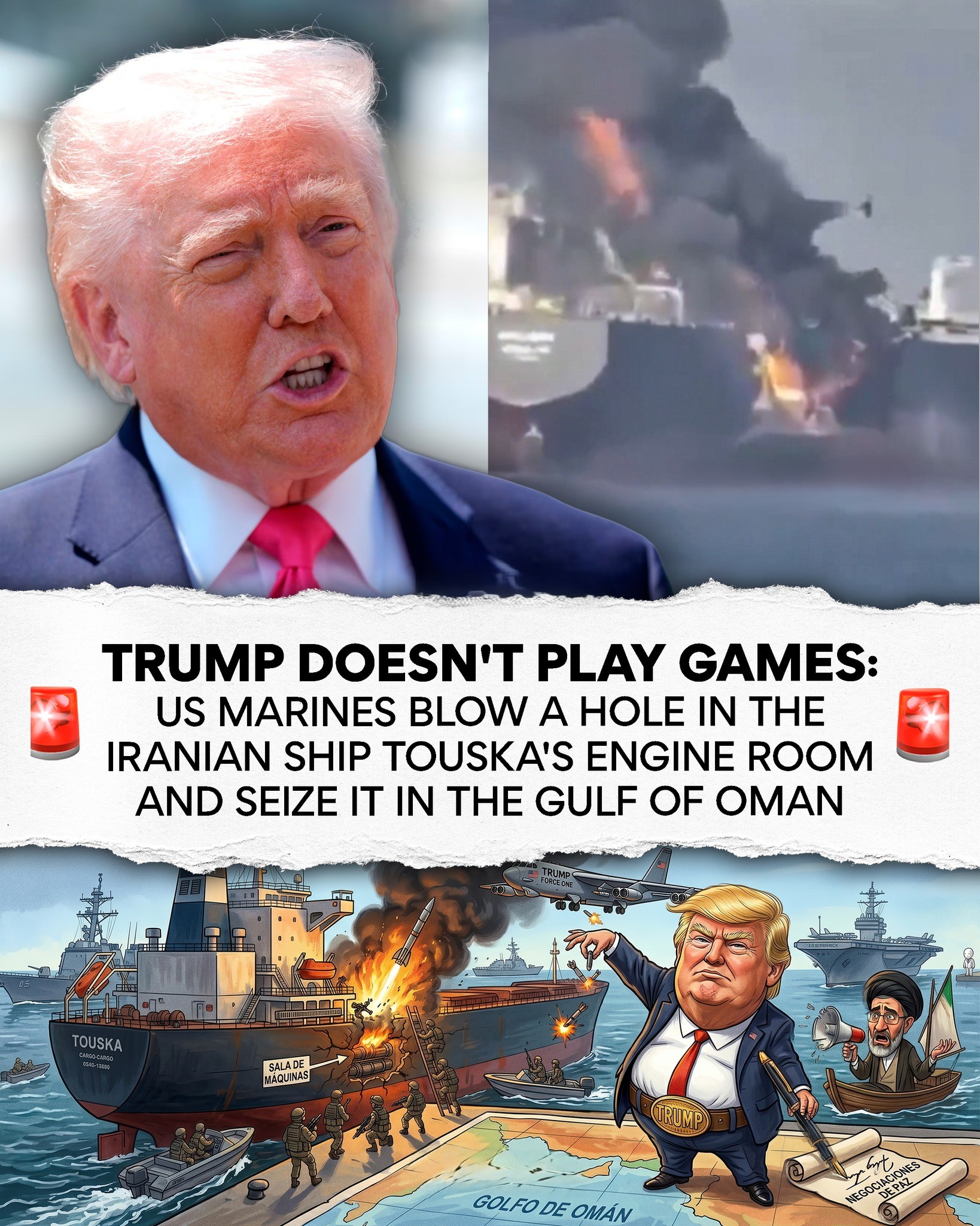 TRUMP DOESN’T PLAY GAMES: US MARINES BLOW A HOLE IN THE IRANIAN SHIP TOUSKA’S ENGINE ROOM AND SEIZE IT IN THE GULF OF OMAN nt