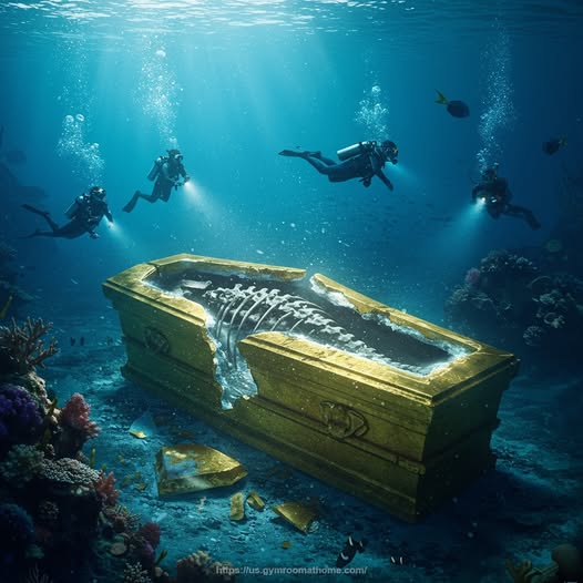 A deep-sea expedition has revealed one of the most extraordinary discoveries in modern archaeology — a massive golden sarcophagus buried beneath layers of coral, rock, and time itself. Found resting nearly two miles below the surface, the coffin is adorned with complex engravings that shimmer under artificial light, each symbol carved with a precision impossible to attribute to any known ancient culture. The tomb’s design bears faint echoes of Egyptian and Mesopotamian craftsmanship, yet the inscriptions are written in a completely unknown script, with geometric patterns that resemble constellations or tidal maps.
