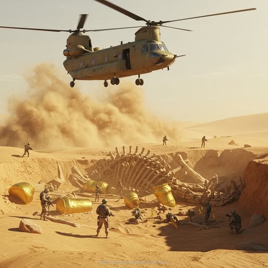 A shocking archaeological event in a remote desert region has sparked global outrage and fascination after reports emerged that the military has taken full control of a mysterious excavation site. What began as a routine geological survey allegedly escalated when a team of scientists unearthed massive fossilized bones resembling a ribcage — each spanning several meters — lying beside an array of golden artifacts and ceremonial objects of unknown origin. Within hours, military helicopters and armored vehicles surrounded the area, blocking civilian access and confiscating all recording equipment.