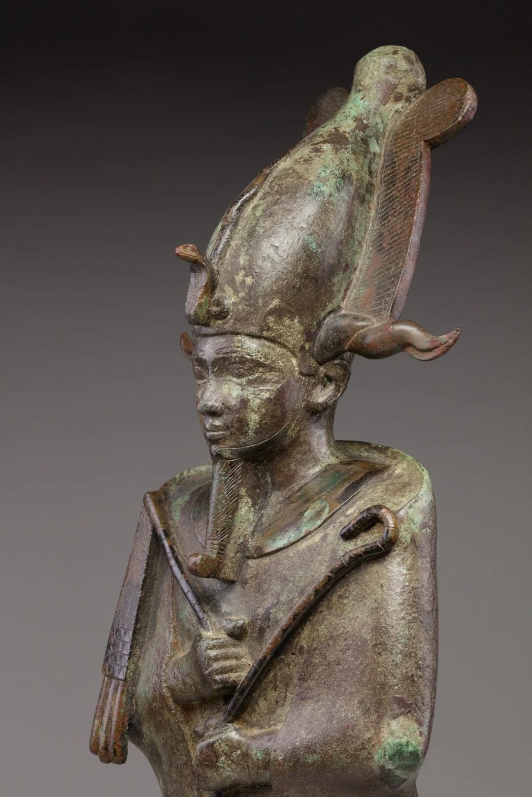 The upper part of a leaded bronze statuette of the god Osiris  , dating to 664–332 BCE during Egypt’s Late Period (Dynasties 26–30)  . Depicted as the 𝘮𝘶𝘮𝘮𝘪𝘧𝘰𝘳𝘮 god of the afterlife, Osiris symbolizes rebirth and eternal order. This finely cast piece, measuring 45.7 cm in total height, is now housed in the Metropolitan Museum of Art, New York