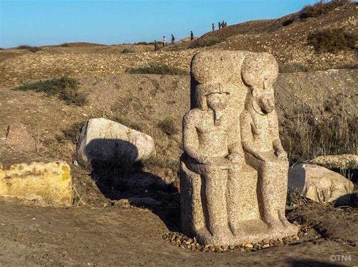 This majestic double statue depicts Pharaoh Ramesses II standing beside the lion-headed goddess Sekhmet, symbolizing royal power united with divine protection and strength.