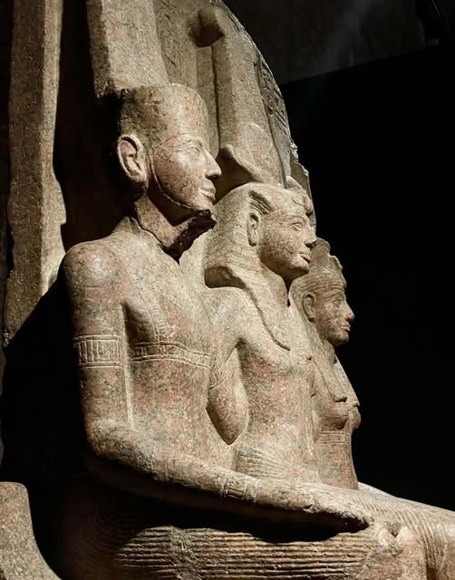 This remarkable triad statue depicts Pharaoh Ramses II seated between the god Amun and the goddess Mut, the divine couple of Thebes. Traditionally, triads also include their son Khonsu, though here the focus is on the intimate connection between the pharaoh and the gods.